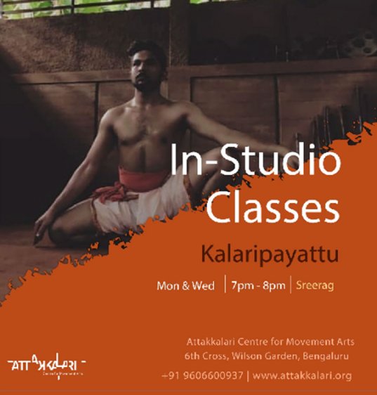 | In-Studio Classes at Attakkalari Kalaripayattu, Bharatanatyam, Contemporary KALARIPAYATTU FOR ADULTS WITH SREERAG ![]() Kalaripayattu is an ancient Indian martial art form that is dynamic,powerful and challenging. Our faculty Sreerag will take you through the essential postures, salutations and fundamental techniques. Classes are open to beginners, and designed to go step by step. Details: Days: Monday & Wednesday Timings: 7-8pm Fees (Drop in): INR 300 Fees (Monthly): INR 2000 Fees (3 Months): INR 5000 For more details contact: 9606600937 / info@attakkalari.org BHARATANATYAM FOR KIDS WITH ANNAPOORNA ![]() Discipline and expression are two of the many gifts of starting to learn, understand and grow through the art of Bharatanatyam from a young age. Our classes are now available offline every weekend and come join us at our studio. Details: Days: Saturday & Sunday Timings: 8-9am Fees (Drop in): INR 300 Fees (Monthly): INR 2000 Fees (3 Months): INR 5000 For more details contact: 9606600937 / info@attakkalari.org ATTAKKALARI CONNECT ONLINE CLASSES While all our classes at the studio are held with limited numbers and social distancing protocols, our online class programs continue for students from across the world. You can join in for contemporary dance, kalaripayattu, yoga & Kathak too. ![]() For more details contact: 9606600937/9972950973/9945446116 info@attakkalari.org |