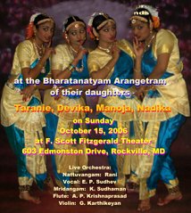 15, 2006 Rockville, MD![]() Dancers: Devika, Manoja, Nadika, Taranie (Four Sri Lankan sisters) Guru: Rani David, Kalairani Natya Saalai Venue: F Scott Fitzgerald Theatre, Rockville Civic Center, 603 Edmonston Dr Time: 3.30pm e-mail: kns@ranidevi.com For more details: www.ranidevi.com/events.htm / 301-439-7264 Orchestra: Rani - nattuvangam; EP Sudev-vocal; K Sudhaman-mridangam, AP Krishnaprasad-flute; G.Karthikeyan-violin This arangetram features 3 padhams in Sinhalese plus the Vanama - 18 characters - merging Sri Lankan Kandyan myth with Bharatanatyam for the first time. |