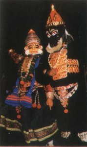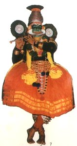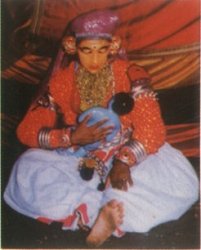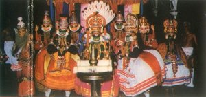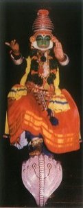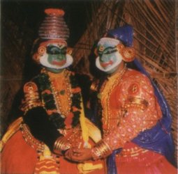 Krishnanattam, a visual treat by Padma Jayaraj, Trissur e-mail: padmajayaraj@sancharnet.in June 14, 2004 Krishnanattam, a dance oriented theatrical performance is the product of the Bhakti movement. Prince Manvedan of Kozhikode, Kerala, India who scripted and produced this visual treat bequeathed a unique performing art to the cultural stream of Kerala that culminated in the world renowned Kathakali. Born to pay homage to Krishna, Krishnanattam has refused to adopt innovative themes- both its strength and limitation. And it demands a special ambience, as it is the synthesis of dance, spectacular costume, music and rhythm re-enacting a cosmic play in macroscopic dimensions. The texture of the performance and its resonance draw the audience into a specific communion rooted in Bhakti, the intense self-negating love, the soul and spirit of the Krishna cult. In the evolution of the dance drama, Krishnattam is a milestone. It incorporated drama from the rarefied performance tradition of Koodiyattam, ancient Sanskrit drama; dance from the ritual performances like Theyyam, and folk dances like Kaikottikali. Its artistic beauty lies in its costume, make-up and dance steps. It remains a one-troupe theatre because of the Sanskrit text. The original Krishna Geethi is sung in the background in Sopanam style to the rhythmic beat of the madhalam and chengala recalling the entire gamut of Bhagavatha stories. And the performers dance to the rhythm of the music that rarely coincides with the narrative. The dancers have their own text made up of gestures, movements and tableaux evolved by countless gurus over decades. The hand-held curtain punctuates the rapid scene-changes making the story leap forward. Krishna is ever present, pervading the atmosphere and on the stage in his solitary splendour. And the spectators experience a multitude of ecstasies intensely personal, yet part of the collective consciousness. Guruvayoor temple is the sole patron of Krishnattam. Every year there is a continuous performance of Krishnattam starting from September 1st for eight days. People watch Krishnanattam in its traditional format from the divine descent to renunciation, and rounded off on the ninth night with Avatharam again to stress the cycle of life and death. Eight becomes a mystic number: the story of the eighth incarnation of Dasavathara, born as the eighth son of Devaki, told in eight chapters in eight continuous nights with eight measures of oil that burns eight wickers lighting the lamp. Avatharam opens the performance. Bhumi Devi tells of her woes under the stranglehold of evil to Brahma, the four-faced who promises her quick relief. In the next scene, after the marriage, Kamsa the all-caring brother transforms himself into a demon when his life is threatened. And he dominates as the overwhelming power of the evil until Vasudeva promises to deliver all their unborn children into his hands. In the next scene Lord Vishnu descends in his Viswaroopa and the parents prostrate in worshipful reverence. Does it symbolise our own times: of the greed of Power, and the burden of the unborn? Away from the enchanting myth the scene depicts psychological realism, a moment of truth when each couple realises that their child is a gift from God, godliness incarnate! Then follows the charming pranks of the boy Krishna told and retold by countless artists over centuries, of which the Indian mind is never tired…an aura of eternity plays around when the stick in Yasoda's hand asks, "Telling lies…?." " No, no…no…!" is the guilt-ridden frantic answer. How human, yet how divine!! Oh, you fall in love, deeply with this adorable, boy-god that carries joy in his heart. And India has named her boys after him down the ages. ![]() ![]() On the second night Krishna grows up in stature for his special mission of the destruction of evil. The stories are narrated in verse while the scenes like Poothna Moksham, Bakasura Vadham, Kaliya Mardhanam are displayed in spectacular masked dances. And they are interwoven into the idyllic life of Krishna in the pastoral settings of Gokulam. The powerful thandava dances of the fighting scenes alternating with the lasya style of the celebrations of his triumphs build up the tempo as Krishna grows up in heroic proportions. Yet, the Vasthrapaharanam in which Krishna enjoys the visual treat of the naked beauties keeps him down to earth. ![]() ![]() Rasakreeda on third night depicts one night of erotic bliss on the banks of the Yamuna: one night of music flowing from his flute that drives lovelorn hearts crazy, one night of dreams for the dreamers of all time to dream of, one night of love for all the lovers to treasure in their hearts. Adolescence blossoms here. Generations have grown up with the youthful Krishna setting their hearts aflame; the mystique of love setting their souls on a trail of aching, yearning, longing. This quintessence of romance is presented in a harmonious ensemble steeped in feminine grace. All the males that play the Gopis exude femininity. Mullappoo Chuttal, the celebrated garland-dance, is rich in old-world charm. The fluid movements of the dancers weave circles, and triangles, in twos and threes; in liquid meanderings they dance in circles and ellipses around the lighted lamp. Its patterns unfold like petals of blossoming flowers of an endless garland. Krishna dances through, in, and out of these changing patterns in charming glitter. Clanging cymbals, jingling ankle-bells, soft thuds of dancing feet controlled by the loud gong create a symphony. As music surge, the ebb and flow of a hectic round of love draws the spectators into an emotional participation. The throbbing madholam resonate their heartbeats as the Gopikas scintillate with Krishna in an astral plane, the glory of Krishna cult. Kamsa Vadham, the performance of the fourth night, is the turning point in Krishna's life and philosophy. ![]() ![]() Swayamvaram, on the fifth night enact the marriages of Balarama, and