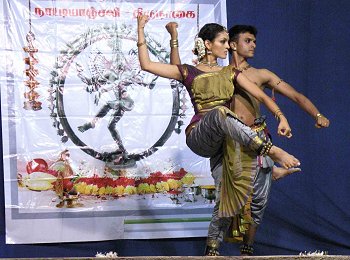 The Natyanjalis - Rukmini Vijayakumar, Bangalore e-mail: raadhakalpa@gmail.com March 23, 2010 The classical Indian dancer exists purely out of the passion and love that the dancers have for their art. It offers no monetary gain, no substantial fame or media recognition, but just the fulfillment of dance itself. The Natyanjali festivals that are organized across the temples in Tamil Nadu are a standing example of how dancers flock to perform in a place where their art is understood, appreciated and watched with rapt attention. The temples offer a spiritual ambience that supports our art. Dr. Padma Subrahmanyam always says that "wherever we dance, that place is automatically sanctified and becomes a temple." In the Natyanjalis, the temple that we create with our dance in union with the temple that the devotees create from their devotion and prayers, resonate and create in us an experience that magnifies itself in the spiritual context. Audiences in the thousands come to the temples during Shivratri and watch the dancers perform traditional Indian classical dance. A large, attentive audience for the classical arts is difficult to find in the metropolitan cities of India today; unfortunately because the youth is so influenced by the west that they have no connection to their cultural roots. But, we must remind ourselves, that India is not only in the metropolitan cities that we live in. India is in the smaller towns and the villages making the mass of the population still "Indian" in thought and culture. My dance partner Parshwanath Upadhye and I had the opportunity to perform at the Natyanjali festivals earlier this month and it was heartening to see that so many people still watch classical Indian dance with interest and attention. Not only do they watch, but they are culturally aware enough to understand our stories of Shiva, and laugh at the comic moments and be moved with emotion when Shiva protects his bhaktas. We traveled through Mayavaram, Tanjavur, Tirunallar, Nagapattinam and Kumbakonam, driving from one place to another to be greeted by warm smiling faces and organizers that were happy to have another dancer that is devoted to the art amongst them.