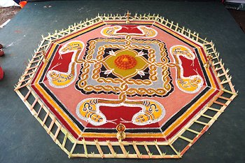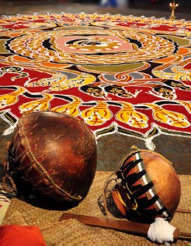 Sarpam Thullal, a mystical dance, an experience - Padma Jayaraj, Thrissur e-mail: padmajayaraj@gmail.com November 22, 2010 As India celebrates Diwali, central Kerala revives a folk ritual practice in the Malayalam month of Thulam. Serpent worship used to be part of folk religion in this tropical land. Today, it is alive as a ritual ceremony for wellbeing and prosperity, with the message of environment conservation. There are snake groves attached to olden homesteads where female priestesses safeguard the snake as a deity. On a rain swept afternoon we meandered through a pot-holed road to the heart of a hamlet in Kerala, in the South Western state of India. I wondered about the fruitfulness of braving the torrents. Could I ever peep into the heart of a ritual tradition with the analytical frame of a modern mind? Yet the journey could be worthwhile, as I had only heard about this ancient ritual practice and never seen it performed. Supernatural practices have been part of primitive culture. Many tribes all over the world in the past worshiped animals and plants for different reasons: out of fear, as symbols of fertility, prosperity and so on. Ancient homesteads have retained their shrines dedicated to snakes as part of Nature worship. And at these shrines, Sarpam Thullal is an annual performance by the members of a special community called Pulluvar, a community of village minstrels. Legend says Parasurama, who brought forth the land of Kerala from the seas, has given the Pulluvars the right to live by worshipping the serpent gods that are protectors of the land. Now the pullavan pattu evokes nostalgic memories perpetuating an eco-myth. However, some Pulluva families take care to hand over the song tradition, the ritual dance and Kalamezthu, the art of drawing a ritualistic rangoli using herbal colors, down the line. The loud 'tum tum' emanating from an earthen pot with a string attached, announced the event. Roused by a music that plucked at the heartstrings, people from around gathered at the venue. A small group of rural folk, most of them the members of a single extended family had come to take part in their own special affair in their ancestral home. A group of three men trained in their specialized art of drawing were giving finishing touches to an elaborate picturesque design. Kalamezhuthu is an art itself. Drawing stylized figures of gods and demons that tell of lore and legend for temple festivals are part of the mystical rhythms of folk-art. The carpet like designs are made up of herbal powders. The colors used are white, black, yellow, green and ochre that give a rare vitality with shades of old world magic associated with primitive religions. ![]() Sarpa kalam is the large pictorial arena where this ritual drama enacts its mystique. From the elaborate pattern of vibrant colors, hooded snakes rise up larger than life. The knotted, twining serpents cast a spell under the light from the bell metal lamps. The leafy decorations flutter around the kalam. In deepening dusk, this is sacred ground indeed! Nearby, the small shrine dedicated to the snake is lit like a little temple. ![]() It was growing dark. Two women sang an invocation striking the chords of the kudam that echoed the heartbeat of the night; the lonely aching of the naga veena mingled with the music of rain; cymbals chimed resonant. The young women of the host family holding thalams (brass-plates with flowers and lighted lamps) brought the idol of the snake in a procession from the shrine to the kalam. The crowd waited eager-eyed. The night outside throbbed; the lights glimmered; the rain whined. The leafy decoration of the venue swam in the wind like snakes, their shadows moving in the gloom. The pictures of multi-colored, coiled snakes, and the moaning of the stringed instrument created a strange feel. The songs sprang from the immeasurable depths of our racial memory. Images, long buried, were bobbing up and down the river of life flowing inexorably from the beginning of time. And the velvet music flowed melting everything. Soon, one of the men began to move around the kalam with flaming torches in his hands. Thiri uzhichil is a dance that simulated the eerie movements of a hooded snake. His black head, black finely cut beard, his gleaming eyes, and his rhythmic movements slowly cast a spell. Over the large carpet like design, the twining forms seemed to move in harmony with the movement of the man and the rhythm of the chant. Snakes seemed to slither…. here, there, everywhere. Darkness impenetrable, flickering lamps, a hypnotic dance with fiery balls, wind and rain among the trees…The musical notes mounted, strange, turbulent, insistent, and plaintive. It floated out upon the night losing itself in the rain. Not knowing why or how, it touched my untutored heart. I sat compelled and involved in an electric atmosphere. As I listened, some strange wonderful magic made something within me stir, flutter, and then soar. ![]() The young girls who sat cross-legged among the patterns of hooded snakes began to sway. It was surreal: their closed eyes, their trembling hands, their flowing hair, and their sleepy state. Their swaying bodies moved everywhere as if the pictures of the snakes had risen alive. Hysteria shook some other women of the family. One rushed from within the house as if in sleep, took the silky white bunch of the buds of the palm tree, mumbling visibly and began to sway and dance. They wiped the kalam off by dragging their bodies, pulled the leafy decorations, swayed and moved around. It was a snaky world! Questions were asked; answers given; futures told; problems solved - all in trance! The whole scene seemed part of a dream, a voyage beyond space and time. The songs, the singers, the dancers, and the viewers were transported into a world of tuneful magic with the fragrance of myth, fact, and fantasy. And the night poured out its soul in melodic resonance. The snaky figurines crawled towards the shrine. P