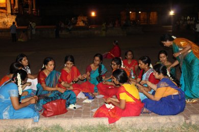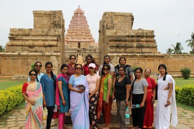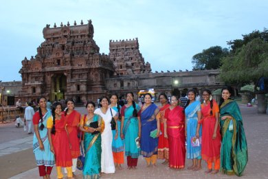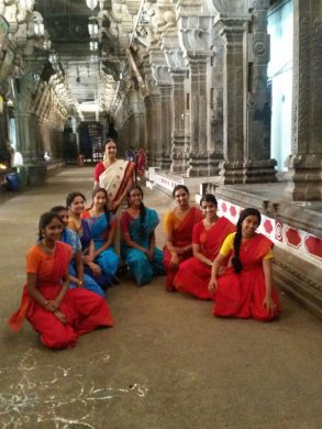 My dance and culture trip to Tamil Nadu - Tara Panicker November 10, 2015 This year I had a very special start to my summer holidays. From the 20th to the 25th of July, I travelled with my dance teacher, Usha Raghavan, and six of her students (along with their guardians) on a temple tour around Tamil Nadu. We visited four temples: first, the beautiful Thillai Nataraja temple at Chidambaram, then the quietly resplendent Gangaikondacholapuram temple, the impressively grand Brihadeeswara temple at Tanjavur, and most significantly, the seat of dance, Thyagaraja Temple at Thiruvarur. Teacher has organised trips like this before: taking her students from UK and Italy on a tour of temples which are associated with Bharatanatyam and sometimes even other dance forms. This trip, however, was different, in that the first week would be spent in Tamil Nadu, and the second would be touring dance performances in Sri Lanka. The India tour hence was incredibly busy, but also incredibly enriching. Though this was a tour of some of the most significant temples in Tamil Nadu's history, it was not restricted to just that. We also visited some fantastic sites which offered us a wider understanding of the history and culture of Tamil Nadu and South India: the Dakshinachitra model heritage village in Mahabalipuram, a village in Tanjavur where the famed Tanjore sculptures and paintings are made, and even a veena-making shop. Dakshinachitra was both educational and enjoyable. It had been constructed in the fashion of an old-style village to offer an insight into the customs and behaviour of South Indians, and featured aspects of the four Southern states (Tamil Nadu, Kerala, Karnataka, Andhra Pradesh). For example, we saw a traditional village home from Tamil Nadu, and were given an opportunity to try our hands at various activities, such as pottery making, basket weaving, and grinding flour, all demonstrated by artisans from villages which used the same (or similar) techniques passed down over the generations. Mahabalipuram was my favourite of these three stops, followed closely by Dakshinachitra. It consists of a group of monuments built by the Pallava rulers around the 7th and 8th centuries. These monuments are unique - they consist of the five Pandava Rathas, the Panchapandava cave temple, several other mandapas, and the most famous rock-relief, describing Ganga's descent onto the earth, also known as Arjuna's or Bhagiratha's Penance. I found the experience of seeing these monuments amazing - the Mahabharata has long been a much-loved text for me, and I had never even imagined that shrines had been built for its heroes. However, they were left incomplete, and so these shrines are not worshipped at, but they still offer an awe-inspiring and beautiful sight to admire. I also appreciated the design of each Ratha, as each was built in line with its namesake's characteristics. The most impressive detail about all of these shrines is that they are all monolithic structures, each carved from a single rock. The size of the temples suggests that the rocks used for the temples sloped from south to north, in keeping with the laws of vastu-shastra - or as we know it, architecture. ![]() Chidambaram temple ![]() Temple entrance with karanas We reached Chidambaram in the late afternoon. The most prominent Shiva temple in India is guarded at each corner by a colourful gopuram, with images of devis and devas and many other deities painted with pinks, reds, yellows and blues - almost every colour imaginable was featured on those gopurams. Each gopuram is oriented towards one of the four cardinal directions, all exactly the same size and shape. There was a huge crowd teeming around the temple, waiting for the evening puja performed for the spatika linga. We were then ushered outside to observe the palanquin ceremony. This consisted of the deity in the form of Palaiarai Nataraja being placed on a palanquin and taken to his beloved consort Parvati, who waits in their bedchamber every evening. The occasion is celebrated with great pomp and splendour with music from every conceivable instrument, such as the melam, maddalam, nadhaswaram, jalra bells, and the conch, serenading the god. The deity was also fanned and shaded by an umbrella, and women devotees drew kolams before the procession. The crowd followed the palanquin, singing songs and clapping their hands in time to the music - it was truly an impressive ceremony to observe and take part in. Once the evening ceremonies were concluded, we sat on the steps before the Nataraja shrine and appreciated the atmosphere - the worshipping of the devotees, the flickering of the deepams, and their reflections on the painted images and shrines - a meditative, soothing experience. The next morning we woke up bright and early, and after breakfast, Teacher showed us how to wear our dance saris for the first time. It was especially interesting for me as I've had a great deal of difficulty attempting to wear normal saris before! Luckily these dance saris are shorter to drape than traditional saris, and Teacher's demonstration and helpful tips made it all seem very simple. We reached the temple later than anticipated, arriving at 8:30 instead of 8am. As a result, instead of our friend the honourable Dikshitar showing us around the temple after we had danced, we would have to return in the evening for our tour. We would soon find out the reason for this! After watching the morning puja, we were led towards the huge dhwajastambam and invited to dance. All of us students performed several dances, beginning with Anjali Stotram and finishing with Kavuthuvam. After that, Teacher wanted to at least show us the water tank, even if we could not see the rest of the temple in the morning. However, the flag stones of the temple had been heating all morning underneath the fiery summer sun, and we barely made it halfway across the blazing uncovered stones before we had to turn back - and run for shelter befor