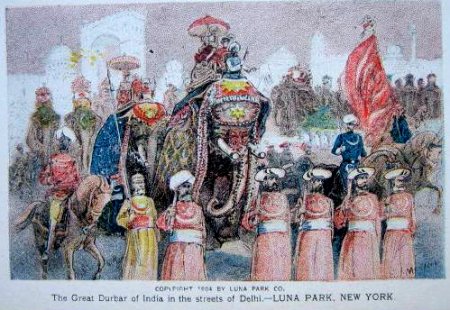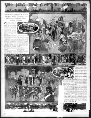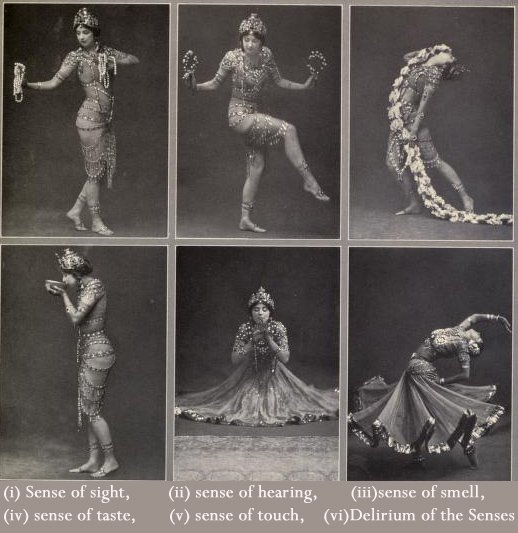 Furthermore, this invitation had its genesis during an 1879 visit to India by General Ulysses H Grant (commander of Abraham Lincoln's Union army during the American Civil War, and president of the US from 1869 to 77) during which trip he was treated by the then Maharaja of 'Jeypore' to a nautch performance. Daly's troupe of four teenage nautch dancers - Vagoirba, Ala Bundi, Oondabaisa, and their leader Sahebjan - stayed over the especially hard winter and, sadly, did not fare well in New York. Ala Bundi, as well as a child born to Sahebjan, died of typhomalaria within four months. Nevertheless, this historic visit led - 24 years later - to another Indian attraction in NY, this time at Coney Island's Luna Park: an exhibit called 'Streets of Delhi', which is important to our story because Ruth St Denis was very taken with it. In fact, it is likely that this exotic scene with its elephants, turbaned drummers and other musicians was the genesis of St. Denis' 'Radha', which she premiered within a year. We have many photographs of St Denis in 'Radha', but it is a collage of images of Radha by the celebrity photographer Otto Sarony (found at a site put together by videographer Johannes Holub) that tells us how the dance was inspired by the five senses. Moreover, in a 1941 video excerpt of the 'Delirium' finale (from the Jacobs Pillow Archives) one sees her, accompanied by six seated men in dhotis and a kneeling drummer, twirl herself into delirium until, in a whirl of her ghagra skirt, she falls senseless to the ground.