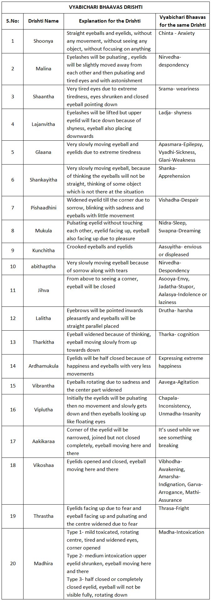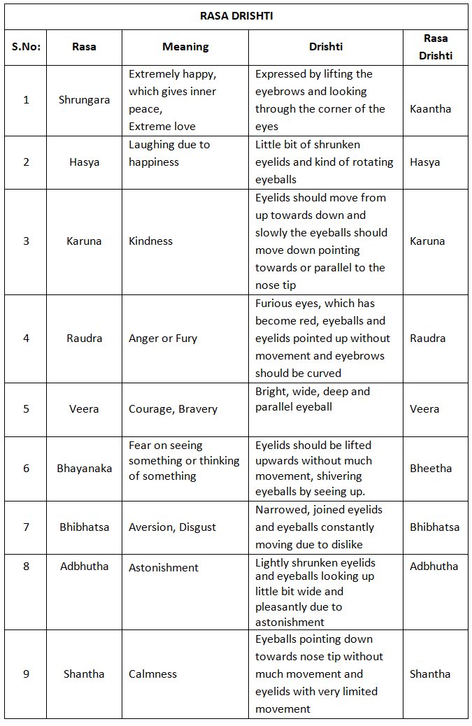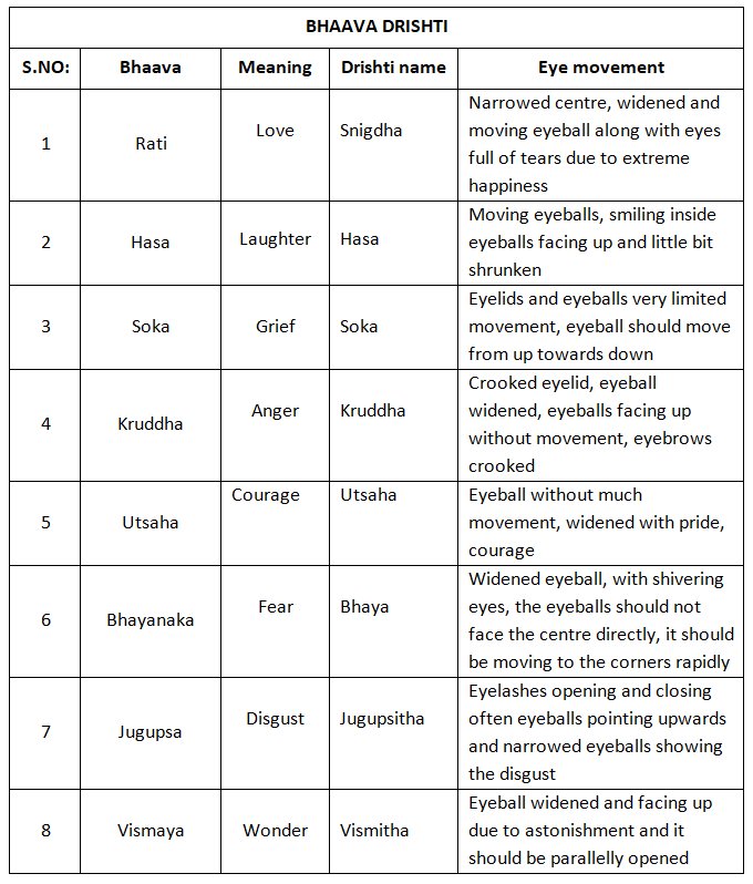 Speaking the Art of Aesthetics through the eyes - Compiled by Dr. S. Divyasena e-mail: divyanjali.divineoffering@gmail.com November 9, 2020 Introduction Bharatas Natya Shastra is vast like an ocean and is layered with very profound thoughts and ideologies. It is a boon to researchers, dance practitioners, scholars, teachers and students. As we all know, eyes or drishti plays a vital role in creating an emotion or Bhaava to evoke the relevant Rasa. I hope this small attempt of mine to consolidate the 178 Slokas in Chapter 8 of Natya Shastra, will act as a tool and give you an insight in understanding the importance of drishti in Rasa. The following tables illustrate the different eye movements used to create all nine rasas, the stayi Bhaavas and how to express the vyabichari Bhaavas. What is Rasa? It is explained with an example in Natya Shastra - like how a person experiences the taste of food cooked with all the ingredients like spices, the people enjoy the rasa (taste) while it is expressed by different psychological states. ![]() BHAAVA DRISHTI - Why is it called so? Derived from the word bhaavayanthi - it means they infuse the meaning of the play. The idea of the author is expressed by means of words, expression, gestures, colour of the face, etc. ![]() VYABICHARI BHAAVAS DRISHTI Here vi and abi are prefix and chara means to go or move which means that it carries something. It carries the emotion. ![]() Dr. S. Divyasena, a Ph. D from SCSVMV University, is the founder-director of Divyanjali, Chennai. She is the secretary of Prayathnam (a forum of young committed dancers and dance teachers) and an A grade artiste of Bharatanatyam and Kuchipudi. Comments * Thank you for this article, ma'am. Very useful. - Sneha Cheralathan (Feb 9, 2025) * Vast topic explained in a beautiful way....good article. - Malavika (Nov 11, 2020) * A beautiful and valuable compilation... It can be a very useful teaching aid for all teachers. There is so much to learn from this! (Nov 10, 2020) * Well compiled and written. So much depth and detailing just in the eyes. This topic is so relevant for all the dancers/teachers to easily give those nuances of abhinaya which helps to bring out emotions so precisely. Great article! - Swarna (Nov 10, 2020) * Beautiful article, Divya ma'am, thank you for this knowledge sharing. Keep continuing with your great work. Best wishes. - Preethi Padmanabhan (Nov 10, 2020) Post your comments Please provide your name and email id when you use the Anonymous / blog profile to post a comment. All appropriate comments posted with name & email id in the blog will also be featured in the site. |