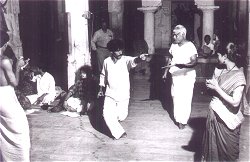 THIRUKKURUNGUDI AND KAISIKI NATAKAM REVIVAL by Daasan, Oppiliappan Koil Varadachari Satakopan Nov 2001 ![]() ![]() The Mahimai of this Kshethram Thirukkuruhur Satakopan was born due to the blessings of the Emperuman of this dhivya kshethram. The parents of Nammazhwar (Maaran and Udaya Nangayar) prayed for the blessings of a child and Thirukkurungudi Nampi responded to that prayer. Thus incarnated Nammazhwar. It is at Thirukkurungudi, Thirumangai who blessed us with the six Tamizh Vedanghams for the four Tamizh Marais (Vedas) of Swamy Nammazhwar ascended to paramapadham. Thirumangai blessed us with 25 of the 40 paasurams associated with Thirukkurungudi Nampi. Swamy Nammazhwar performed Mangalasasanam with 13 paasurams. Periyazhwar and Thirumazhisai blessed us with one paasuram each. Here came Acharya Raamanuja for 'mangalasaasanam' and to enjoy the Subhasraya Thirumeni of Thirukkurrungudi Nampi. The Lord of this 'dhivya desam' was so pleased that He took on the form of 'Sishyan' and approached Acharya Raamanuja for kaalakshepam on Vedantha meanings in general and the esoteric meanings of 'Thiru Ashtaksharam' in particular. The stone by the river side, where Acharya Raamanuja sat and performed 'Upadesam' to Thirukkurungudi Nampi is known as Thiruparivattap-Paarai and it is still there for us to touch and have 'Acharya Sambhandham'. Thirukkurungudi Nampi was "initiated into the Sri Vaishnava fold" by Acharya Raamanuja himself in the traditional manner and received the daasya namam of Vaishnava Nampi from Acharya Raamanuja. The Kshethram Details: There are six sannidhis. Perumal gives us His darsanam as Sri Vaishnava Nampi, Malaimel Nampi, Iruntha Nampi, Kidantha Nampi, Thirupparkkadal Nampi and Thirukkurungudi Nampi. Thayar has the naamadeyam of Kurungudivalli Naacchiyar. Lord Siva as Ahirbudhnya is at His temple between the two temples of Ninra Nampi and Kidantha Nampi . The sannidhi for Malaimel Nampi is at Mahendra Giri, a hillock, some six miles away from the main sannidhi. Thirupparkkadal Nampi is at His temple on the riverbank. The main temple is a big one with beautiful sculptures. Until recently, there was a colony of bats at the temple and the TVS Family under the leadership of Sri Venu Srinivasan, Sri Suresh Krishna and Srimati Anita (Raajyalakshmi) Ratnam drove out the bats with a newly discovered sonic sound system. The cleansing took a full three years to accomplish and the Sannadhi is now free from " the bat bhakthas " who had their own kalahalam for a few years. Anita Ratnam has done a 'mahapakaram' by reviving (reconstructing) the ancient dance-drama known as Kaisiki Natakam . Three years of tireless work led to her first performance on the last Kaisiki Natakam (November 19, 1999) based on Nampaduvan's unique worship of Thirukkurungudi Nampi on Kaisiki Ekadasi day. In the Varaha Puranam, Perumal tells Mahalakshmi about His great joy in being worshipped through dance and music. The Kaisiki Natakam is a dance - music- drama going back to seven hundred years. The story of Nampaduvan born in a chandala caste and his promise to the Brahma Raakshasan about being his food after the worship of Thirukkurungudi Nampi and the happy resolution with the intervention of the Lord is a pious story that transcends the divisions of class and caste, when it comes to the Bhakthas of Bhagavan. The Kaisiki Ekadasi is as sacred as Sri Vaikunta Ekadasi; Aasthikas fast that day and listen to Kaisiki Puranam being read at Srirangam or the Kaisiki Natakam performed at Thirukkurungudi and listen to the music and dance in praise of Nampi Perumal .There is an audio cassette rendition of this Kaisiki Puranam by the Sri Vaishnavite scholar Dr.Venkatakrishnan of Thiruvallikkeni. Since the passing away of Sri T.V.Sundaram Iyengar, the Kaisiki Natakam performance was discontinued and in 1999, after a 44-year hiatus, thanks to the efforts of Anita Ratnam, this dance drama has been performed in the Nampi's sannidhi from 1999. The scale of this effort has to be understood and appreciated in the context of non -availability in full form, the script, music, movement and style. The previous performers of the old Kaisiki Natakam group have become old and had to be encouraged to come back on stage and share it with others from Tanjavur as well as those from Melattur Bhaagavatha Melam community. Anita Ratnam has written a special article on the November 19, '99 Kaisiki Naatakam performance at Thirukkurungudi in Sruti magazine (July 2000 issue) and from there, one can understand the magnitude of the effort to reconstruct the Natakam after such a long time of lapse. There were 3,000 persons, who enjoyed the 3 hour and 15 minutes performance with a total of 22 actors and musicians. The age of the oldest actors from previous times was 84, who took a brief role. The reconstruction process continues and Nampi Perumal had a preview on November 19, 1999. The second performance was on December 7, 2000 and this year the KAISIKI NATAKAM will be staged at the temple on NOVEMBER 26, 2001. Before the start of the NATAKAM, Anita Ratnam and her troupe of talented dancers make an offering to Perumal through dance in an hour long NATYA ARADHANA. It is only after the performance that the KAISIKI NATAKAM begins around 10:30pm. It is my sincere hope that this information is available to Bhaktas all over India and around the world so that they may be able to travel to this 'dhivya desam' and obtain the blissful 'punyam' that awaits all who sit in the presence of Perumal on the night of Kaisiki Ekadasi. Thank you Anita for your marvelous contributions to reconstruct this dance-drama! Note: KAISIKI NATAKAM was performed on November 26, 2001 at Tirukurungudi. For further information contact arangham@gmail.com |