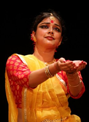 Two dazzling gems at Navaneetham's Yuva Nrithyathi - Supriya Rajan e-mail: supriya.dancer@gmail.com Photos: Sreenath Narayan October 24, 2014 It was a perfect treat on Vijayadasami to watch a recital by Tabasmi Paul Majumder on the first day of the two day Navaneetham Cultural Trust's Nrithyathi - Vibes of Youth Festival held at Kerala Sahitya Academy Hall, Thrissur, Kerala. Based in Hooghly, Tabasmi, a disciple of Guru Malabika Mitra and undergoing advanced level training with Guru Rajendra Gangani, was a personification of devotion to her gurus and the art form. Much to the delight of the audience, Tabasmi gave a vocal invocation to goddess Saraswati before she began her Kathak recital with a Durga Vandana. The dancer presented the various moods of goddess Durga in the piece "Jaya Durge." The quick transition of expression on the dancer's face from the fierce Kali to the benevolent Durga was a delight to watch. 'Taalanga' in vilambit teen tal was the next piece. With firm footwork and beautifully executed tukdas, Tabasmi presented the different elements of the dance form on a platter. Trained in both Lucknow and Jaipur gharanas, Tabasmi interlaced her concert with tukdas from both styles. 'Kavit' is her guru Malabika Mitra's specialty and the disciple had no shortfalls in presenting it with all its delicacies. The dancer took us through the many moods of child Krishna with her pure abhinaya telling the story of Kaliadaman. She moved on to gath nikas gracefully passing through the gaits of Radha, gopikas and peacocks. Dhrut teen taal was exposed though toras, parmelu and parans. Tabasmi had the audience completely absorbed in the concluding piece, a Meera Bhajan "Hari Tum Haro." With her skillful and natural abhinaya, she engaged the audience with her portrayal of Draupadivastraharan, Narasimha Avatar and Gajendra Mokhsa. Her skillful portrayal of the deceitful Shakuni and the defeated Dharmaputra were memorable.