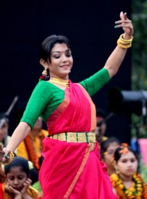 Vasanta Utsav, presented recently by the dance institution Jahnavi under the able guidance of noted Bharatanatyam dancer Madhubani Chattopadhyay and the music school Dakghar under the baton of the Santiniketan-bred accomplished musician Manoj Murali Nair - in collaboration with Unicorn Dance Academy, Behala Nrityapeeth, Nrithyoday, Nrityangan Kathak Kendra, Payal Chakrabarti Dance Academy, Kalamandir Manipuri Nartanalay and Santiniketan Sangeet Bhavan alumni - was literally a gigantic affair. Almost vying with their Santiniketan counterpart, they mounted, to start with, a saffron clad procession of over 300 strong artistes, threading through the spectators in the vast garden space, accompanied by resonating drummers. Thereafter, children's section of Dakghar provided choral support to an assortment of junior most group dancers. These were mood dances, conveying the spirit and essence of Tagore's vibrant lyrics: In the nascent joy of Falgun, I weave my cadenza...; O brothers, Falgun has engulfed the forests, branches and offshoots, flowers and fruits, all nooks and corners...; and Aren't they all listless without a semblance of cause... Then sauntered in the middle section of Dakghar to support musically another set of blossoming dancers for the songs: Dribs and drabs flow the fountains of colour...; O the southern breeze, rock us in your cradle...; and Flowers have set ablaze the blue horizon... ![]() Debalina Kumar