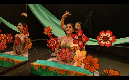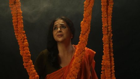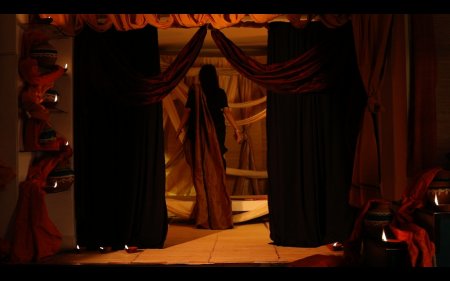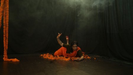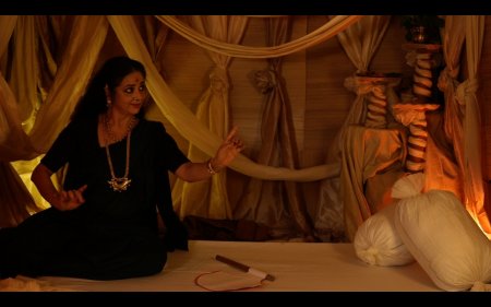 And Sharmila takes upon herself to don all the three roles and does a brilliant job of them. The setting all through is provided in an interview format between Sharmila and the art critic Kathakali Jana and filmed adroitly by Neelay Sengupta. Departure, the first presentation, starts on a frolicsome note, with a Scottish ditty Ye banks and braes... by Robert Burns, providing inspiration for a young Tagore at 21, to follow with an undulating tune to compose Amidst the flowers in the bowers, beside the flowing river..., and with teenage dancers (Rohini, Debottama, Tanushree, Raagini and others) from Sharmila's OVM group providing the traipsing around the eager, yet fading mother. There are brilliant camera shots and mix-and-match of images to a distant echo of a few notes from the raga Malkauns. The accent is uniformly on jovial conviviality creating the milieu for a faintly painful breaking loose coming up soon...
