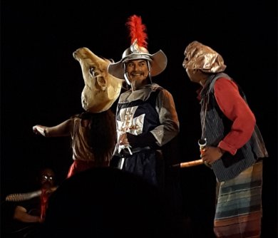 ![]() e-mail: ukb7@rediffmail.com Masquerade of grandiose dreams Photos courtesy: Avishek Ghosh May 17, 2018 Miguel de Cervantes, belonging to the 16-17th century, was considered as the greatest litterateur of the Spanish language and one of the world's pre-eminent novelists. His masterpiece Don Quixote has been translated into more languages than any other book except the Bible and is considered as the first modern novel, a classic of Western literature and among the best works of fiction ever written. The story follows the adventures of a noble man who reads so many chivalrous romances that he loses his sanity and decides to set out to revive chivalry, undo wrongs, and bring justice to the world, under the name Don Quixote de la Mancha. He recruits a simple farmer, Sancho Panza, as his squire, who often employs a unique, earthy wit in dealing with Don Quixote's rhetorical orations on antiquated knighthood. Don Quixote does not see the world for what it is and prefers to imagine that he is living out a knightly story. Man of La Mancha, a 1964 musical by Dale Wasserman was inspired by Cervantes and his 17th century masterpiece Don Quixote and tells the same story of the "mad" knight Don Quixote as a "play within a play" performed by Cervantes and his fellow prisoners as he awaits a hearing with the Spanish Inquisition.