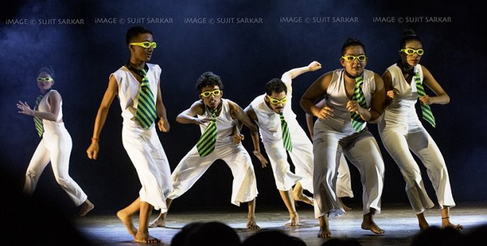 Presented by Dancers' Guild - Manjushri's institution -- on March 28, Ranjabatir Janye (for Ranjabati), to commemorate the latter's birthday, was a breath of fresh air, happening after a long time. The program began with an Upanishadic hymn Tamiswaranang - chanted by the recorded voice of the iconic Bengali singer Debabrata Biswas - to which a large number of junior artists of Dancers' Guild traipsed with enthusiasm, with burning lamps in hand. The idea was to visualize a transition from darkness to illumination, also from untruth to palpable honesty as well as from death to immortality. The little dancers made multiple patterns on the stage and created waves and arcs in an enticing manner. Next was Aami (Myself), the journey of a girl and her struggles, performed by members of Dancers' Guild. Choreographed by Mithun Banerjee, a performing artist of the Guild, it was a major foray into burning women's issues, supported by audio-visuals on the cyclorama. For instance, it made the telling points that daily 2000 girls' embryos are destroyed in the mothers' womb; in a single year, 12 million minor girls are married off and driven into premature conceiving of babies, post-marriage; 6 to 8 lakhs of women are trafficked every year for prostitution all over the world; and in India alone, daily 156 women are raped. The passions, the futile struggles and the sufferings came out in beautifully etched body-arches, desperate bonding and dragging unwilling torsos on the bare floors created new kinds of patterns and evolved a linguistic paradigm all its own, to depict anguish, frustration, torture and an utter loss of all human values. It was seen, for a change, how the narrative structure of Nabanritya could rise to the occasion, namely, femininity's ultimate indignation, to create both pathos and silence, to bring out living hell within an erstwhile happy space. Angikam presented next by Nrityalok, had 13 dancers depicting abhinaya hastas and their applications in Bharatanatyam style. Cokpetentlu directed by Sutapa Awon Pradhan, was a long-drawn exercise and, although very sincere in its efforts, seemed a little overdrawn. Music by Srijan Sircar and Debarghya Das was adequately supportive. ![]() Angikam ![]() Ananda Basanta Samagame Ananda Basanta Samagame (At the Advent of the Vernal Joy) was the grand finale presented by Dancers' Guild with all their senior dancers. A seasonal ode to spring - originally created by Manjushri -- it was directed by Jonaki Sircar. Strung to a bouquet of exhilarating Tagore songs on spring, the attempt seemed to concentrate on Nabanritya's kind of choreography and avoid Santiniketan's clichéd style. Starting with the inevitable: Open the doors, you householders, it is the colours outside.., the sequel went on to: O the flowers of Shirish and Bakul, O the wilderness of Sal and Piyal; the tender temerity of: It is the least of touches, the barest syllables of talk...; the boisterous, all-pervading: Come up, one and all, who will give up everything..; the Carnatic tremulous melody of Basanti, the world-enchantress...; the sincere appeal to the spring breeze: Blow slowly, O the listless wind..., punched with: Wake up, O the southern storm...; the slow and ponderous: O moon, who would cradle you and rock you to and fro...; the season's intimation: O my brothers, it is the touch of spring in the woods, the blossoms and the quivering leaves...; and the final fulfillment: O the soul is brimful of grace. The matching mood of the dance kept varying from highly stylized to a throw-away folksiness, back to a wonderfully disciplined group composition, again prepared to break asunder... Dreams with Wings ![]() Dreaming of color & vibrance ![]() Let me fly ![]() Thrust into the rat race How does one view the transition from wide-eyed innocence of childhood to the complexities and paradoxes of an adult world with its own follies and frustrations? What are the models available? Looking to the Western paradigm, once the children cross the 16-year-old barrier, they are very consciously allowed to "break the shackles of parental bondage" and encouraged to "go out in the wide open world" with a total sense of independence as well as choices of lifestyle and livelihood. In a 180-degree paradigm shift, the Indian child is quite often "protected", "guided" or "chaperoned" - use whichever phrase one would wish. Indeed, the child is given hand-holding as long as s/he wishes to have and, worse, often treated as the means to fulfill what the parental aspirations could not achieve in their own lifetime. Is that the right choice? Presented on March 31, Dream without wings at the Sapphire Annual Gala 2019, by the Sapphire Creations Dance Troupe and Sapphire Dance Academy, was an extravaganza, performed by some 50 dancers - spanning the age groups between 4 to 45 years - to tell the story of our children and what they aspire to be. Directed by Sudarshan Chakravorty, who has led Sapphire for all 26 years, the choreography was cascaded - in age -- from the younger lots to the gradually older ones, till one arrived at the professional company, who backed up to provide the "mirror image" of what the toddler alongside wanted to become -- or was it not to become? -- and be fulfilled, or frustrated, as the case might be. The performance had several distinctive features. First, it was portrayal of paradoxes, while the joy of innocence was writ large on the participants, especially in the younger segments, the competitive elements were injected early in life by the elders, as reflected in the choreography. Second, the youngsters were looking at themselves constantly: did they have social approval in what they were achieving and how they were progressing in life? Third, the metaphors of scintillating success and dismal failures were continuously evaluated and reinforced by repetitive dance movements. Fourth, emotions like aggression, nostalgia, loss of innocence were played up and made palpable. Perhaps best t