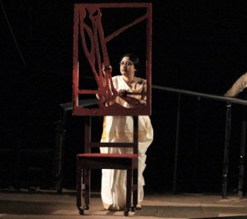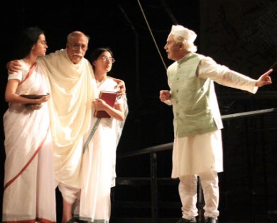 Ekla Chalo Re premiered by Swapna Sandhani on April 5, was brilliant recreation of that recent history with all its actions and repercussions. Under the baton of thespian Kaushik Sen and with a brilliant cast as well as a most competent teamwork of the well-known group, it was a wonderful dramatic experience. The veteran Ashok Mukhopadhyay as Gandhij pushed to depressive segregation; Deshankar Halder's Sardar Patel with his gritty materialism; Kaushik himself as a diabolical Mountbatten; Surajit Bandyopadhyay as almost a helpless Nehru pressed by circumstances; Reshmi Sen as Kasturba - a hapless, yet devoted consort; it was a conglomerate of stellar acting talents. Monalisa Roy as Edwina Mountbatten was adequate, while Loknath Dey as Jinnah was perhaps a shade lacklustre. But, most of all, it was Kaushik's directorial tight-rope walking that carried the day. There could be many slippages - both Hindu extremism raising its ugly head in scheming against Gandhiji and in their diabolical success, sensing the rise of a "Hindu Raj"; and implied involvement of Sardar Patel in stopping the police officer-duo from their hot pursuit of Bapu's intending murderers ("as per Utpal Dutt's original text", clarified by Ashok to this critic) could both go overboard in their sinister implications, but were kept tightly under the leash by the director. It was most admirable how he handled a potentially "fire-raiser" (remember the famous eponymous play by Friedrich Durrenmatt?) script.