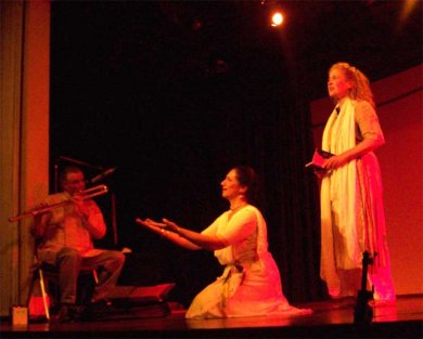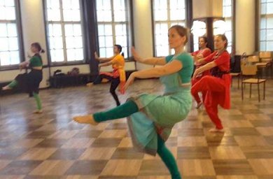 During one of my visits to Frankfurt for World Dance Alliance Asia Pacific Organization, I had met Rajyashree Ramesh, a Bharatanatyam dancer from Bangalore, settled in Berlin. At that time diplomat Mr. Malay Mishra was in Berlin. He had come across my articles on dance, in particular, on Odissi and had found them interesting. Being an Odiya, his interest was naturally in revival of Odissi, but he also appreciated other forms like Kathak and Bharatanatyam. During my visit to Berlin, he invited me to an evening of classical dance performances. From Essen, Birju Maharaj's disciple Durga Arya had come to perform Kathak and Rajyashree was to perform Bharatanatyam. Both of them are versatile dancers in their chosen idioms. On that evening, however Durga Arya was in great form and overshadowed Bharatanatyam with breathtaking chakkars, pirouettes, and footwork. I had known Durga Arya in Delhi performing Kathak under supervision of Birju Maharaj and she is an excellent Kathak dancer. Even when she migrated to Essen, Kathak biradari, community, remembers her well for her outstanding quality of Kathak. Rajyashree was a little upset for scheduling Kathak earlier than Bharatanatyam. I had explained to her that there was no reason to be upset or feel that Bharatanatyam in comparison with Kathak lacks something. It depends upon the mood of the audience also who gets carried away with chakkars and jugalbandi with percussionist and its popular appeal. Bharatanatyam has its own impeccable structure and gradual build up from pure dance to abhinaya and with varnam, it gains momentum followed by leisurely pace of padams, javalis and then quick paced tillana etc. Our dialogue started. I was keen to learn more about her migrating to Berlin and teaching Bharatanatyam against all odds to German dancers. We corresponded and kept in touch over the years. Ten years ago, Indian Embassy and her institution Rajyashree Ramesh Academy of Performing Arts had arranged my illustrated talk on New Directions in Indian Dance in Berlin, but as ill luck would have it, before leaving for Berlin, a day in advance, my laptop, passport, money etc were stolen in London, near a railway metro station, and my visit to Berlin had to be cancelled, as even when Indian High Commissioner issued me the passport on Friday, the visa for Germany could not be given on Saturday and on Sunday my lecture was scheduled, which, alas, had to be cancelled. I once attended the debut performance of Ellen Winkler, her German dancer in Bangalore. It was indeed commendable to see her German disciple perform well. Rajyashree was also studying Laban Notation and was devising a methodology to use it in a manner that would help her German disciples to master Bharatanatyam movements easily. In collaboration with The Tagore Centre in Berlin which is headed by Manjishtha Mukherjee Dutta, Rajyashree worked out a proposal to present excerpts of her choreography of Tagore's songs and my illustrated talk with excerpts of dances of Uday Shankar, Ram Gopal and Mrinalini Sarabhai, interweaving with screening, live performances and ending with "Natanam Adinar" in Bharatanatyam with her eight German dancers. Since Manjishtha Mukherjee knew me from Mumbai and also we had last met in Beijing in 2011, for year of Festival of India in China curated by my friend and renowned director Ratan Thiyam, she readily agreed to schedule my lecture with the screening and Rajyashree's and her disciples' presentation. Besides, Rajyashree arranged workshops for her German disciples for one whole day which was quite a challenge for me. I readily agreed to work out choreographic patterns in nritta and improvisations in abhinaya. ![]() Performance at embassy