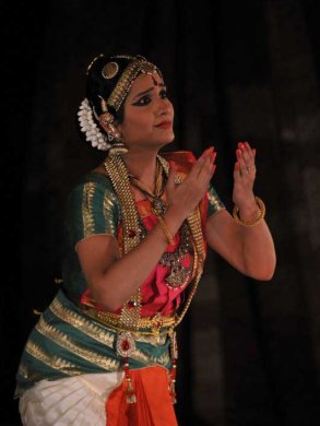 However, she warmed up in Arabhi pallavi in Ektali, with solfa re re pa ma and in leisurely manner performed the pallavi which had old world charm. The slow speed suited the dance form as resolutions of movements looked beautiful. They gather momentum with progression giving visual shape that goes hand in hand in with music. Shagun chose to present ashtapadi Dhira samire Yamuna teere which has the familiar scene of sakhi requesting Radha to go unto Lord Krishna who is waiting for her, preparing bed of flowers, expecting her, looking for her and even when a leaf falls on the floor, he is startled thinking Radha has arrived. This import of ashtapadi is exquisite and Shagun enacted it with feeling. The ashtapadi demands of a dancer to evoke Krishna's state of mind and dancer has to impersonate Krishna. Shagun did justice maintaining dignity of Krishna in separation. The concluding number in praise of Kali could have been more vigorous. Shagun needs to maintain balance when taking sculpturesque poses as any imbalance results in loss of that quality. The musical accompaniment was by Ramachandra Sahoo (vocal), Prashant Kumar Mangaraj (mardala) and Dhiraj Pandey (flute). Unfortunately, Ramachandra Sahoo's vocal recitation did not help as his voice is no more melodious as it used to be earlier. From Raipur, Yasmin Singh presented Kathak as a group dance telling the story of Lord Shiva in his various manifestations. When Sati (before her incarnation as Parvati) begged of Shiva to attend yagna by her father Daksha, Shiva refused to attend it uninvited. Sati went and suffered humiliation, jumped into fire and died. On learning of it, Lord Shiva with his entourage went and destroyed yagnavedi, picked up Sati's body and performed Tandav unleashing fury. In next birth as Uma, daughter of Himalaya, she performed penance, Kamadeva aimed arrows at the Lord, who opened his third eye and turned Kamadeva into ashes. Parvati and Lord Shiva were married. Yasmin Singh further elaborated the theme with elements of Shakti and Shiva, Kali dancing in violent mood and inadvertently placing her foot on Shiva's chest, was embarrassed and regained peace. The various shlokas, popular bhajans, familiar to the audience succeeded in sustaining interest in the entire production with commendable technique by both male and female dancers, Yasmin taking lead role. In such works, Kathak is shown as a peg and story is enacted with mnemonic syllables of Kathak, footwork and chakkars, and unless balanced with careful editing the production suffers from excess of movements and also katha vastu. Yasmin Singh would do well to keep this in mind. The music by Biswajit Chakravarty was appealing, but more editing of the production would have created better impact. ![]() Yasmin Singh and group ![]() Daksha Mashruwala and group Group choreography of Guru Kelucharan Mohapatra found a felicitous expression in senior dancer Daksha Mashruwala's presentation. A seasoned dancer trained under direct supervision by Kelubabu during his workshops in Mumbai at NCPA, for longer durations, she and other dancers had benefit of Guruji's new compositions and intensive studies like gurukulavasa. It was like 24 X 7 and that foundation showed in her solo and group presentations along with her own choreography of Basant, interpreting Basant as hero with five arrows being thrown on nayikas, intensifying feeling of love, to the music of Asit Desai. Manoj Desai (no relation of Asit Desai) has a melodious voice, an asset bringing out the nuances of the song as in ashtapdi, and evoking mood of the season. Daksha's Dhira samire ashtapadi coming as it did after Shagun Bhutani's presentation, stood out for clarity of movements and choreographic vision of Kelubabu. Using the various level of platform Daksha used the space, showing Krishna looking for Radha's arrival and also preparing the bed of flowers. The falling of a leaf as conceived by Guruji, the bird seating on a branch of a tree and the gentle design the falling leaf created were sheer visual delight. It is a treat to watch such imaginative touches by dancers who had benefit of guruji's direct supervision. Daksha treated Guruji's Durga choreography interpreting each dancer of her troupe, consisting of Namrata Mehta, Subrata Tripathi, Anuradha Sandhavi, Tamanna Tanna, Rubi Jain, as Durga with infinite forms, various weapons and elements, which looked interesting. The finale with Sarva mangalam bhavati, let there be auspiciousness everywhere etc., was evocative. Daksha's Odissi presentation did justice to Guruji imbibing spirit of his dance. 3rd Day Shinjini Kulkarni displayed her taiyyari in Lucknow gharana Kathak following the tradition of her maternal grandfather Pandit Birju Maharaj. She has an attractive stage presence and shows confidence in whatever she performs in terms of technical short numbers like tode, tukde, paran etc. She also created the rhythm of the speed of train with entertaining element of Kathak, dialogues between two friends through mnemonic syllables. Rendering abhinaya to the song by Bindadin Maharaj, depicting Krishna's chhed chhad, pranks, Shinjini followed the tradition she has inherited. However, in this area she has to work more to project expressions convincingly. Kalinath Mishra on tabla, Zohab Hasa, sitar by Naveen Mishra and lighting by Anupam Joshi aka Bunty were adequate. But Shinjini would do well to have a stand by for padhant because that gives time for breathing. ![]() Shinjini Kulkarni ![]() Lavanya Shankar Lavanya Shankar from Coimbatore, a disciple of K.J. Sarasa, stood out for her neat lines and pleasant Bharatanatyam presentation. Accompanied by a team of ace musicians including Murali Parthasarathy (vocal), Sridevi Priya (nattuvangam), K. Parthasarathi (mridangam) and Atul Kumar (flute), Lavanya was in form. Performing Suryashtakam with silhouette looking at Chitragupta temple, with her figure in shadow, she succeeded in creating magic using the space. Prasid mama 