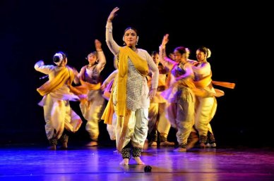 Trained in Kathak under great masters like Birju Maharaj and with other gurus at Kathak Kendra in Delhi, Parwati is well equipped to undertake a novel theme. To illustrate it with several Kathak 'intra- forms' like kavits, tukdas, parans, parmelus, ladis, tatkar, chakkars, using her own background in music in Dhrupad, Parwati succeeded in highlighting the inter-relationship between two visual forms, plastic art of calligraphy, and visual art of dance. ![]() The origin of sound, the progression with Panini's sutras, Sanskrit Maheswar shlokas, iconic images of gods, goddesses, Nrittavsane Nataraj etc, evoked images, connecting with projection of several eye catching drawings of calligraphy which showed the complexities of the form and response to the forms in word, rhythm time cycle, singing and movements. In one section in vilambit teen tala, to the tuneful rendering of sarangi instrument, graceful movements, variations of that were reposeful, unhurried and gave feeling of 'sukun' - quietness, peace. Namo shabda rupe and with padhant, recitation of Hara Hara bol, the shapes corresponding with projected calligraphic images showed what deep thinking and hard work had gone into this production. Taking Bindu - spot, rekha - line, and exploring it with Dha taka thunga paran Jodi aamad, Parwati elicited spontaneous applause for use of dha, and musician Manoj Desai's speaking dha at right time, were connoisseurs' delight. Using Sul taal of ten matras, Dhrupad composition of Tansen, Parwati progressed to section using 4 scrolls hanging from ceiling with calligraphic images of Ali (lion of Allah), Phoenix, Bismillah and Hana Ka ((Japanese, meaning aura of a dancer) with Japanese dancer's image done with as it were a single stroke. Parwati weaved in and out of these scrolls with excellent lighting and approximating movements with calligraphic images of lion and flying bird, to the prayer to Allah with calligraphic image of Om and other script also suggesting God/Allah. The mnemonic syllable Dha, excellent ladi, earlier 'tum rab tum sahib', 'tum rahim tum karim,' 'tumhi karatar, ghat ghat puran' etc., were imaginative and captivating. The use of various forms/drawings of calligraphy along with performance succeeded in establishing the inter-relationship between two forms. It was a visual treat, original and imaginative. All the musicians deserve congratulations for such team work. Their understanding of dance while providing music for Kathak movement and Parwati's concepts was praiseworthy. Here was Kathak breathing life into the form, away from speed, mere chakkars and noise. ![]() During post performance discussion Manjari Sinha spoke eloquently about the imaginative way the music was composed by Parwati and performed by the musicians. She also pointed out where there could have been better accompaniment. Thoroughly well versed and seeped in music, Manjari eulogized the musical textures, embellishments and brought the subtleties to the notice of the audience. I enjoyed this analysis which helps audience to appreciate the hard work which goes behind creating this innovative work. The appropriate movements and accordingly the use of music were like two arts going hand in hand. I spoke about the original concept and beauty of calligraphy, inspiring the dancer to choreograph such beauty in Kathak. Next day in Pravahi, in group work Parwati explored the concept of River through 3 artistic and philosophical perspectives. It is known to all of us that river is the life giver to this planet. But Parwati had used the concept of river as a metaphor to describe knowledge, divine thoughts. Within Pravahi, three dance productions AJARAA, VAARI and VEGINI were presented. Ajaraa portrayed mystic river Saraswati. Selecting appropriate richas from Rigveda to describe river Saraswati in a group choreography she created various ways the water generates waves and moves. Atralupta Sarswati goes the saying. The costumes, selection of colours, the movements for the group with her seasoned disciples and lighting were pleasing, not crowded. The formed circles with chakkars were also pleasing as there was no attempt to employ chakkars to impress audience and win applause. The dancers performed competently and it looked unlaboured, natural and articulated the concept well. What was interesting was that Parwati planned to use Marathi compositions, which in particular, communicated to the audience in Aurangabad as majority of them speak Marathi. In Vaari, she used the life and teachings of Saint Dnyaneswar. At Mahagami Gurukul, we see a statue of young Dnyaneshwar. He had suffered rejection in life, was not allowed to lead life happily. His Dnyaneshwari Gita was imaginatively used for some of the images. Saint Dnyaneshwar had at young age taken Sanjivani sharanagati. The group at the back and Parwati in front enacted the philosophical meanings and to typical ovi she used 10 and half matra, maitrik chhand. Images of Ardhanari Nateshwar were alluded. The dancers in typical Maharashtrian costumes, evoked familiarity, singing songs which women sing daily, the games they play, holding hands and taking chakkar et al in Kathak evoking touching emotions.
