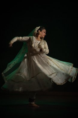 Such a production is a result of excellent teamwork. Credits are due for concept, choreography - Vaibhav Arekar; research script - Pradnya Agasthi; music composition - Sudha Raghuraman; percussion arrangement - Satish Krishnamurthy; dramaturg, light, costume design - Sushant Jadhav. The musicians are: nattuvangam - Kalishwaran Pillai, vocal - Sudha Raghuraman with Megha Bhat and Gautam Marathe, mridangam and ganjira - Satish Krishnamurthy, flute - G. Raghuraman, violin - R. Sridhar. Dancers were Vaibhav Arekar, Esha Pinglay, Ruta Gokhale, Poorva Saraswat, Mrunal Madhura and Radhika Karandikar. The Madhavi Dance Festival was curated by the managing trustees Rama Vaidyanathan and Dr. Arshiya Sethi of Kri Foundation. Rani Khanam attempts a rich amalgamation of Sufi/Bhakti poetry Photos: Prasad Siddhanthi After an interval of three years, I watched vastly gifted Kathak exponent Rani Khanam, disciple of Reba Vidyarthi and Birju Maharaj, in a highly aesthetic presentation, at Delhi's Habitat Centre on 10th April. She transported the audience to the realm of abstract philosophical, Sufi and bhakti verses in an effortless manner using Kathak, revealing another dimension of Kathak which explores the Islamic aspect / concepts which merge so easily with not only bhakti but also universal truths. Dressed in white costume with white scarves studded with tiny stars, also the musicians of Abeer Band of two Muslim vocalists Shuheb and Zohaib Hasan, along with Leena Sargam, Shakeel Ahmed Khan (tabla), Nasir Khan (sarangi), Salim Kumar (sitar), and padhant (recitation of bols) by Shikha Sharma, all also dressed in white, with their soulful music, built up the mood of prayer to Khuda (god) which like a whirling dervish, Rani in several pirouettes extending her arms towards sky, appealed to the divinity for his blessings. The commentary in chaste Urdu, with occasional words in English, provided some entry points to non-Urdu speaking members of the audience. The Persian ghazal when summed up, meant that the devotee, as female, was in love with Khuda and was dancing before him. She interpreted it with sanchari bhavas, improvisations of creating cosmos. Khuda playing with sun and moon, covering sky as chunari, a scarf or a sari studded with the stars, the nine planets revolving round the sun like Parvana, the butterfly drawn to Shama, the candle, like the bee which hums around the flower and becomes a captive when the flower closes. 'Have you noticed the movement of fish in water, drops of rain falling, in each such movement I dance from slow tempo to fast one; I am dancing with abandon, in public, who pelt stones at me, and my hands are tied, and on my neck is pointed a sword that can hurt me and the blood can flow; despite that I am dancing before you, O Khuda!' This is a rough translation, but Rani with hastas and expressions created the images, drops of rain, then pouring rains through footwork and tintinnabulations of the ghunghroos. 'I surrender myself to death because I am dancing, I am in love.' The poetic imageries were accessible, if not the Persian words. The transformation through hand gestures and ecstasy was evocative leading to rasanubhuti, the aesthetic relish.