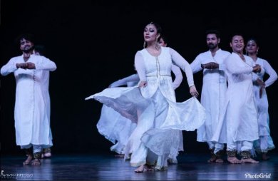 In the 10th edition of the Kendra Dance Festival curated by Shobha Deepak Singh, Kumudini Lakhia presented Movements and Stills featuring some of the excerpts asking Anuvi to design new costumes. Barring one male dancer Pankaj, the five other dancers were from Delhi, whereas all female dancers including lead dancer Sanjukta Sinha were from Kadamb's repertory. As Kumudini says in her choreographer's note: 'I am creating a structure of the fabric of Kathak technique designed to create patterns in space and time.' We see three dancers in dim light in graceful bent pose raising their arms over their faces to the note of melodious flute and slowly they appear clearly with other dancers and perform simple tode, tukde taking exquisite pirouettes dressed in whitish costumes with their skirts and covering layers holding their ends and waving a la Flamenco dancers. Keeping their heads high they execute movements which we all know as Kathak. But the way Kumudini presents them it looks refreshingly new. The youthful maidens cross the stage, move in circles, forming various patterns in two separate groups and challenging each other to dance the way they dance. The footwork is flawless and the patterns created enhancing their beauty. Among them the lead dancer Sanjukta Sinha dances taking leaps and landing on sam draws our attention for her incredible energy. Dhamar is described as an obeisance to the gods in heaven. It is written by Bindadin Maharaj in his ashtapadi of Lakshanageet composed in tala Dhamar to the music by Madhup Mudgal. Six young dancers dressed in long shervani like costumes enter from one end of the wing on stage in a walk becoming a warrior, and to the music displaying vira rasa, perform to the song Shankara bajave damaru and create a vision of various gods in heaven playing veena, and conch. For 'Shankha bajave Brahma, Narada veena' and so on, they dance vigorously in a tandav mode, executing footwork, breathtaking chakkars in fast tempo and the audience starts clapping spontaneously. The Dhamar tala becomes their challenging mood. Padhant, recitation of mnemonic syllables or bols, is an inevitable part of Kathak repertoire. To turn it into a special number looked quite innovative. Gyandev's imaginative lighting with two trellised windows on the back quite high and six dancers and six female dancers seated on the floor, gave a sense of the backdrop of a great height and as it were they were in a palace. They start reciting the bols 'thai tat a thai tat aa thai thai aa' and so on. The girls recite and the boys respond, like jugalbandhi creating repartee. Gradually rising in its ascending order the bols create hypnotic effect. Then one girl gets up and performs chakkar, the other two join her then the boys get up and in no time the entire group performs variations reciting 'agraferi kavach palata', the salient features of Kathak as penned by Bindadin Maharaj, taking movements in front with chakkars, and executing palatas throwing arms sideways body facing back drop, and dance in fast tempo. The spirit of challenge permeates the composition. And one enjoys it. One feels that this is entertainment. The joyous mood continues. The finale Tarana saw all dancers dressed in snow white costumes and bluish criss cross pools of light, moving on stage like creating illusion of white swans. Composed and sung by Madhup Mudgal the dancers flew across the stage. The jumps were light, pirouettes mesmerizing, lighting magical, the spirit of jugalbandhi catchy and the visual impact indescribable. Sanjukta Sinha danced as if the stage belonged to her; the female dancers moved crossing the rows of male dancers, turning all into a large circle, with foot work keeping the rhythm intact. They formed pairs, filled up the stage in arresting patterns, melting with each other, creating centripetal and centrifugal patterns in abundance, they brought down the house. Such virtuosity and flawless technique won them rounds of applause. It was infectious, the joy of watching Kathak in this way. It had a balletic look, and yet completely steeped in Indian ethos.
