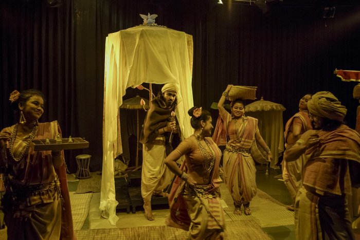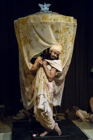 ![]() e-mail: sunilkothari1933@gmail.com Bhaanotsav: Reconstructing of Rupaka and Uparupaka Photos: Amarendra Nath Dutta March 12, 2020 Established in 2013 by Kathakali exponent and Sanskrit scholar, musician, musicologist, actor, director Piyal Bhattacharya, Chidakasha Kalalaya, Kolkata's aim is to undertake research and practice of Bharata's Natyasastra as prayoga, presentation, reconstructing of Rupakas, which are Rasatmaka, and Uparupakas which are Bhavatmaka. Following various elements of Natyasastra, the recreation of Bhana as Rupaka and Bhanika as Uparupaka by Piyal has further opened up a new chapter in the field of classical theatre, drama and dance-dramas. Devoting his entire life to the study of Natyasastra, the music as referred to in Natyasastra, learning it from classical musicians, within India and abroad in terms of pan Indian approach, recreating instruments as mentioned in Natyasastra, like veena and harp, Piyal has taken a journey which indeed is not an easy one to grasp. It expects of the spectator also to have background of Natyasastra, knowledge of Sanskrit and also Pali, Prakrit and other allied languages - a tall order. In 2013, Piyal staged Bhanika at National School of Drama, New Delhi, which generated interest amongst scholars, directors, dancers, critics. He has been active all these years gathering like-minded actors, dancers who are willing to join him in this journey. With meager financial support but with lot of enthusiasm they have envisioned a form of Marga Natya. The Bhaanotsav under review is the first one which is based upon the monologues. Bhana, Vithi, Prakarana, and Prahasan are the types of Rupaka that were employed as a tool to educate the society in which exist social evils. The plot Kathavastu of the Rupaka is creative. In Bhana, an actor renders dialogues, enacts various characters. They may extend to fourteen characters. Thus, in Bhana the actor received rigorous training of acting and also fluidity to move into different characters. Another addition to this festival was reconstruction of Uparupaka, minor dramatic form that developed in the medieval period. Unlike Bhana, this type was employed to propagate spiritual awareness and elevate the spiritual consciousness of the society. In Nataka, there is a character of Sutradhara, a narrator. Similarly, in Bhana a character known as Vita belonging to the middle stratum of the society, as a narrator exposes the human follies, especially sexual hypocrisy in the respectable society. Verbal dialogue (Bharati vritti) forms the core of Bhana and Kaishiki vritti imparts a subtle aesthetic sense. Shringara, amorous love, and veera rasa are mainly evoked in this mode of performance. Vita helps the romantic character in his romantic aspirations. He acts as a messenger between a Ganika, courtesan and a Nagarik. He is an improverished person who partly knows some of the performing arts. He is an expert manager of a brothel. He is a good orator and efficient organizer of brothels. He cherishes the romantic affairs of the others which he expresses with his actions, utterances and attire. According to his caste, the region he belongs to, he is shown as authentic character with help of location, attire and language. ![]() A scene from Padma Prabhrutikam The Rupaka, the play Padma Prabhrutikam (Lotus Consent) is set in the city of Ujjain, during the spring. The play unfurls with the journey of a messenger, Vita, named Samvatsara of Muladeva, king of Pataliputra. He carries a token of love, Prabhrutaka, a lotus in his hand. Muladeva in spite of a happy alliance with his wife Devadutta falls in love with his sister-in-law Devasena. Samvatsara carries a lotus as a sign of Muladeva's offering of passion to be given to Devasena. Samvatsara starts his journey in the city of Ujjain with invocation to the guardian of the city Mahakala, the personified cosmic time. He explains the content of the play in a nutshell. He comes across a galore of interesting characters. His witty vernal expressions keep the audience enthralled. He encounters a visitor to the brothel where at the entrance he finds the owner of the brothel, who demands money to enjoy sex with the prostitutes. He gives the money which she does not find enough. He tries to go in but he is driven out and falls on the floor, his headgear rolling all over the street and the onlookers laugh at him. He covers his head and runs away to the giggle of the prostitutes. Then Vita comes across a Buddhist Bhikshu, covering his face in saffron cloth and confronts the Vita, who questions him about his identity. To each reply the Vita makes fun of him taunting him that the way to Niravana is not to the road leading to brothel. Exposed, the Buddhist Bhikshu runs away. Through laughter and wit, the audience is conveyed the message from old stage actor that his dharma as an actor is to perform and entertain others by enlightening them, which is ultimate Nata Dharma. Thus, through a light hearted and funny presentation the play actually engages the audience in a serious, social and psychological subject. Sayak Mitra, the actor performing the role of Sutradhara, Vita, carries the entire burden of the play on his ability to act, recite, wear expressions, wit and sarcasm and entertains the audience. Sayak is well versed in various languages and has written the script and also assisted in composing music. The Natya Kutapa consists of seven female actors /dancers, and five male actors, musicians, set designer. They are seated in semicircle with instruments, harp, eka tantry veena, drums, cymbals and so on. The chorus is another feature of the play. The umbrella covered with cloth, from Manipur, lit up with exquisite lighting provides excellent visuals. The umbrellas are draped in slightly off saffron colour. In the centre is a creeper which has lotuses and that is suggestive of the name of the play Padma Prabhrutikam. The female dancers sing, giggle, move with sinuous gestures, and sugg