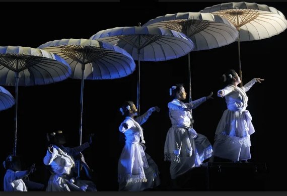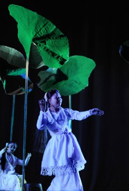 The play under review echoes his statement. Apparently a simple tale, it speaks of seven nymphs who have been flying round the world, witnessing the changes in the nature, environment and human condition. Ratan speaks of peace of sky, earth, water, trees, men and as a metaphor makes nymphs fly towards the 22nd century. The inbuilt commentary of 21st century is articulated towards the end. And also during the gradual unfolding of the play as what the seven nymphs observe. Our culture and tradition derive from food gathering, varieties of magical fertility rites, connectivity with ancestors, earth, sun, moon, sky, forest, water and creatures. It is in these areas that Ratan is at his best. The seven nymphs dressed in pure white costumes, with white lighting, slowly carrying the large dishes, dance gently to little tinkling of the music. Those who are familiar with the Lai Haraoba dance tradition of Manipur would at once appreciate Ratan's drawing movements from tradition. It has a slow but mesmerizing quality. Immediacy of life experiences is recalled in movement, sound and rhythm. The nymphs move waving their scarves creating illusion of flying across the sky. When nymphs see a king who had destroyed nature and his wailing, they realize how protection of nature is important. The sequences of nymphs entering water, and in a surrealistic scene of covering their faces entering water, the scene like underwater is breathtaking! When a group of bird catchers with their net try to catch the nymphs, they fail and the nymphs laugh at them. The play tries to decipher many challenges faced by our rituals and traditions which carry the identity of our culture inherited from our ancestors. ![]()