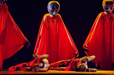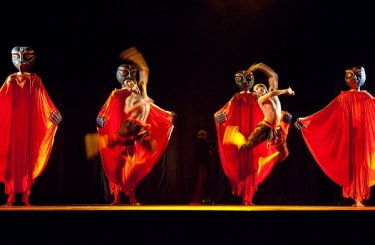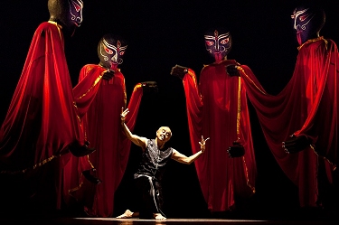 Astad Deboo Dance Foundation's Interpreting Tagore - Dr. Sunil Kothari e-mail: sunilkothari1933@gmail.com Photos: Vipul Sangoi May 8, 2012 On 30th April, hot on the heels of World Dance Day celebrations, the one and only Astad Deboo, along with dancers from Salaam Baalak Trust who he has been training for the past four years, presented Interpreting Tagore with select eight dancers. The programme at Kamani Hall was in aid of Salaam Baalak Trust. The house full performance is another feather in the cap of Astad who has been for the past 40 years performing contemporary dance winning laurels. And his concern for less privileged section and children has brought cheer to the disabled children and street children. Of the four selected poem of Gurudev Tagore - Surrender, Your Grace, Walking Tall, Awakening - the one which indeed amazed the audience was Your Grace which cast a spell. So unusual and spectacular was it in its concept, imagination, colour and scale that one shall remember it for a long time. As a matter of fact, from all other numbers, Your Grace stole the show. Akash Khurana's recitation of the poem in English set the mood. The English translation runs as follows: Mother, I shall weave a chain of pearls for thy neck with my tears of sorrow, the stars have wrought their anklets of light to deck thy feet, but mine will hang upon thy breast. Wealth and fame come from thee and it is for thee to give or to withhold them. But this sorrow is absolutely mine own, and when I bring it to thee as my offering thou rewardest me with thy grace. The four young dancers performed before the image of a figure with three masks, faces of Kali, using Mayurbhanj Chhau movements with aerial movements around the mother figure. But then lo and behold, from the audience walked four larger than life tall figures dressed in red, with masks of Goddess Kali and walked up on the stage, where as a devotee Astad bowed to these four Goddesses. The scale of those four Goddesses was so big that the presentation took one's breath away!