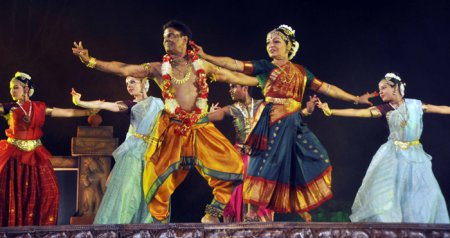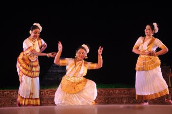 Raja and Radha Reddy and their troupe followed Madhavi's presentation. Raja offered a prayer in praise of Vaishnavi Devi in raga Bhairavi which the Hindustani vocalist Aditi Sharma rendered melodiously. Raja with minimal movements, looking upwards at all pervading Shakti in various forms, as Narayani, counter part of Purusha, and in the end the dancers standing behind each other as multi- armed Goddess Durga with various weapons in her arms, to which as a devotee Raja bowed, was an excellent image. Pt Ravi Shankar has composed a lilting tarana in Nat Bhairavi raga, which is a very popular number. Raja has choreographed a pure dance number on that music. Using the upper level of the stage, the young dancers danced with eye catching Kuchipudi movements. At one juncture there was silence in the composition and audience started clapping, but soon the final movements followed and dancers earned applause again. Oothukadu Venkatasubbaiyer's "Natavar taruni Krishna" began with Krishna's rasa krida and to the epithet for Krishna for Gitopadesh, Raja wove the incident of Arjuna seeing his own relation at Kurukshetra battle field, and did not want to use Gandiva weapon to kill his own kith and kin. Krishna displays his Vishwarupa (cosmic form), instructs him to fight saying: "Karmanyeva adhikaraste, ma faleshu kadachana" (You do your job, do not expect reward), the shlokas known to every Hindu who knows Gita, the archetypal response to mythology, as a shared experience, and the audience responded with applause. "Yada yada hi dharmasya glanirbhavati Bharata," shloka evokes wonderful responses. Gitopadesha interlude received wide appreciation. Performing on rim of brass plate is de rigour for Kuchipudi dancers. Beginning with "Nitystha padarvinda, Vishwavandita Mukunda" the entire group performed on brass plates, with perfect synchronization and the audience response was heartwarming. It was obvious that there was a predominant touch of Hindustani music, barring Krishnaleela Tarangini tarangam number. It had the usual rhythmic repartee and melodious singing full of Kuchipudi flavor. But there was a general feeling on part of connoisseurs that more of Kuchipudi music was expected. DD Television telecast the entire program live. In an open air theatre, sound and microphones do create problems. Since this was a live telecast, the musicians instead of requesting organizers, when mikes were on for balancing, could have taken someone into confidence for putting mikes in order and thus avoid announcement during a live telecast. Day two Not for nothing is Mohiniattam exponent Bharati Shivaji bestowed with the title Lasya Lakshmi. Her troupe of dancers clad in alluring white sarees with gold border, gold ornaments, side buns with jasmine flowers, looked like apsaras, celestial nymphs from Kerala, dancing in graceful mode, imbibing the gentle swaying of palm trees and bobbing boats in the backwaters of Kerala. Opening with Ganapati stuti, Bharati choreographed the shloka imaginatively, describing the sopana, various steps leading to the sanctum sanctorum. In the midst of the milky ocean, there is a tree, beneath the tree there is a golden platform over which is yet another golden platform. On that is spread a silken cloth on which is sprinkled the sacred rice. On the sacred rice is Ganapati's vehicle mouse on which is seated Ganapati. The devotees pray to him to awaken him from his sleep and bless the universe. The temple doors are flung open with Ganapati swaying his trunk and ears, and his mother Goddess Parvati and father Lord Shiva are seen admiring his beauty. The entire choreography to the full throated singing of Rajagopala, eddakka and melodious strains of veena in Arabhi raga and adi tala, permeated the atmosphere with a feeling of devotion. It was followed by a prayer to Goddess Saraswati. Mohiniattam form with its inherent slow graceful movements was explored beautifully by Bharati and danced by her young sprightly dancers with elegance. Mukhachalam, a pure dance number in Ragamalika and Talamalika was performed with leisurely pace indicating the technical structure in the text with 'svaradi panchavarna taladi.' In sopana music in Kerala temples, ashtapadis of Gita Govinda are traditionally sung to this day. Bharati chose Chandana charchita neela kalebara pita vasana Vanamali ashtapadi, set to Pantuvarali raga and adi tala, her dancers playing various roles of gopis, one as Krishna, dallying with gopis. The description of Krishna and the erotic references to pinapayodhara, the heavy breasts of gopis, using a simile of birds making love, Bharati suggestively interpreted the stanza artistically. An interesting scene was of Krishna and a gopi on a swing and other gopis pushing the swing. The playfulness of Krishna and gopis was depicted with imagination. Poet Vallathol's poem Pandattam, metaphorically referring to ups and downs in a life, like ball during the play has ups and downs, was danced by all joyfully. The game of ball, Kanduka, engaged all dancers and they created an illusion of a ball being thrown across the audience and looking for it anxiously. Rendered in Kamboji raga and adi tala, the number has popular appeal and is a favourite with many dancers. As a group composition Bharati did a good job of it. The dancers made an exit in a graceful manner disappearing from the stage. ![]() Bharati Sivaji's group ![]() Meera Das's group Meera Das, a disciple of Guru Kelucharan Mohapatra, with her dancers from Gunjan Dance Academy from Cuttack opened the performance with Sahasranshu, one of the most celebrated epithets of Sun god. Hiranyagarbha means 'golden womb' or 'golden egg' in which was kept the seed of creation. Sun uncovers it and reveals the universal truth. Using Rigveda sukta, Meera Das with conceptual help from poet and critic Kedar Mishra, juxtaposed it with Odiya Bhagavata of Jagannath Das, who describes nature as creator's body, the sun and the moon his eyes, rivers as his veins, mounta