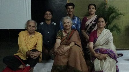 When I glanced through the literature on Mahagami Sangeet Academy (the acronym has been derived from Mahatma Gandhi Mission) I could see in what directions Parwati has succeeded in taking the institution which embraces various streams, not only of training in dance and music, but a welcome holistic approach which prepares a young disciple into a sensitive person, with exposure to allied arts, music, painting, sculpture, crafts, literature, research and fully developed personality. Parwati could have been a computer scientist, has good knowledge and is techno savvy; therefore, the aims of Gurukul have been well explained in the brochure. In Director's message, she has said: 'With a journey tracing two decades, Mahagami is a poised, articulate member of the global arts commune, has many performers, teachers and countless rasikas to its credit and I stand as a proud spectator of this remarkable growth eager to realize manifold existence of Mahagami, the sojourner.' The Gurukul offers training in Kathak, Odissi, Yoga, music, Sanskrit and visual arts. Its departments are named Praspanda for percussion instruments, Anahata for vocal music and melodic instruments, Vyomasad for dance. Courses offered are Arambha, Udbhav and Samarpana. Sadhana is Gurukula camp. I happened to be there when the camp opened. Nearly fifty young dancers, in some cases their elders also join for 15 days in summer from May 1 to May 15, training from morning 6am till 8pm daily. Residential facilities are given. Age limit is kept above ten and registration starts early in April. I could see that there was quite a rush. Aspirants had come from Bangalore, Mumbai, Pune and there were some outstation students. Anushthan - programs for dissemination and promotion of arts for art seekers. Under that in Parampara, demonstrations by senior gurus, performers are arranged. In Vistar, choreographic works are shown. Mahagami has also started Kalasnehi annual rasik membership. There are sections for creation, research, transcription, translations, publication of text books, availability of informative CDs, DVDs and website on arts. What I enjoyed most was learning about Gurukul experience: early morning herbal tea, yoga session, sessions on music and dance, nourishing breakfast and lunch. Evening sessions included demonstrations and short programs by Mahagami artistes. There is also provision for revitalizing and rejuvenating sessions at their Naturopathy centre. One can visit the textile weaving or painting section during their stay. Mahagami arranges for the bookings of Gurukul experience. Nritya Disha: Seminar, workshop on writing on dance ![]() From left, standing: Shamal Ingle, journalist, Parwati Dutta Seated: Dr. Sunil Kothari, Leela Venkataraman, Prakriti Kashyap For the seminar from Delhi, the other two veteran scholars and critics were Leela Venkataraman, who writes for The Hindu every Friday, and Manjari Sinha, who writes for the Hindi newspapers and also occasionally for The Hindu. Others were from Mumbai - Prakriti Kashyap, a Bharatanatyam dancer, also specialized in masked Seraikella Chhau dances, with MFA in Dance from Nalanda Nritya Kala Mahavidyalaya with Sattvikabhinaya topic, and wrote as a dance critic for The Times of India and Ranjana Dave, an Odissi exponent, a freelance journalist, working for online journalism. ![]() Pt Birju Maharaj at Mahagami