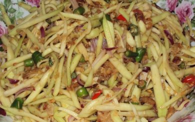 ![]() Health Recipes 9: Mango Kerabu - Uma Pushpanathan January 30, 2017 ![]() Ingredients Group A 1.5 kg unripe mango - skinned, grated or julienne the mango 8 shallots - thinly sliced Mix both, cover and refrigerate it Group B 2 tsp fish sauce 3 red chilli padi - slice thinly 7 tsp lemon juice 1 tbsp gula Melaka - grated 25 gm dried prawns - soak in hot water, rinse when soft and set aside. 3 shallots - cut thinly Belachan is optional Put all the above ingredients into a blender and blend it till 3/4s fine. Once blended keep it in the fridge. Garnish: Whole coriander leaves Peanuts - roasted and pounded coarse Recipe from the kitchen of Uma Pushpanathan ![]() Uma Pushpanathan is a global gourmand and arts enthusiast. Based in Kuala Lumpur, Malaysia, Uma fuses her South and South East Asian heritage into noteworthy efforts in the field of arts, philanthropy, old age issues and food. A renowned cook and hostess, Uma's kitchen is a reflection of her voracious mind and inherent curiosity about world culture through cuisine. Post your comments Provide your name and email id along with your comment. All appropriate comments posted with name and email id in the blog will also be featured in the site. |