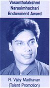 | The Bharat Kalachar, Chennai, conferred the titles of YUVA KALA BHARATHI on December 13, 2002 on Bharatanatyam dancers L Narendra Kumar, Sheejith Krishna, Preethi Athreya, Priya Dixit, Bhargavi Gopalan and Vaishnavi Rajagopalan. The VISHWA KALA BHARATHI award went to Dubai based Natarajan for his invaluable contribution in keeping the Bhagavatamela tradition alive, KALA SEVA BHARATHI award to V R Devika for her service in the field of dance and theatre. Special honors were conferred on Gopi for lights and sound, D S Aiyellu for costumes and Sethumadhavan for makeup. |