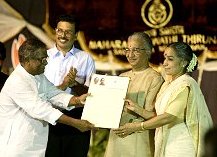 In New Delhi, President APJ Abdul Kalam conferred the Padma Awards on 86 eminent personalities from various walks of life - PADMA BHUSHAN for Bharatanatyam dancer Alarmel Valli, PADMA SHRI for Mohiniattam dancer Bharati Shivaji, Kuchipudi dancer Jayarama Rao, Kathakali dancer K R Kumaran Nair, Odissi dancer Maguni Charan Das and Heisnam Kanhailal for theatre. |