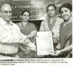 Bala Devi Chandrasekar, Artistic Director, Shree Padma Nrityam Academy of Performing Arts, Princeton, New Jersey, was conferred the VOCATIONAL EXCELLENCE AWARD for her contribution to Performing Arts in General and Bharata Nrityam in specific. The award was conferred by the Rotary Club of Cauvery Tiruchi and Inner Wheel club of Tiruchi (Tamilnadu) in July 2006. |