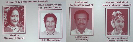 ![]() Bharatanatyam dancer Janaki Rangarajan received the NADANAMAMANI award from Kartik Fine Arts on December 1, 2011 at Narada Gana Sabha auditorium, Chennai. Shruthipriya was conferred with NATYACHUDAR on December 23, 2011 at Bharatiya Vidya Bhavan on the inaugural morning of the Natya Darshan seminar. |