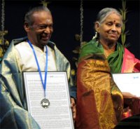 ![]() On December 14, 2012 on the inaugural day of Narada Gana Sabha's art festival in Chennai, the Dhananjayans received this year's NAADA BRAHMAM title and honour. This award carries a purse of Rs.50,000 and gold medals. |