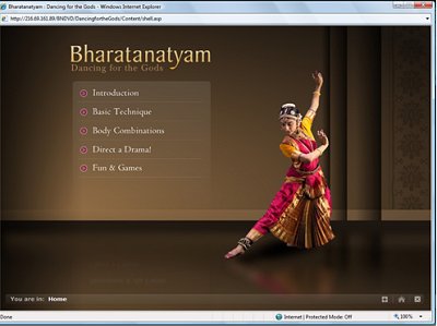 Homepage of Dancing for the Gods website As the success of www.narthaki.com has shown, the Internet offers an incredible opportunity to reach out to an almost infinite number of people. And, as of the last two years, we have sites like 'YouTube' and 'MySpace,' showing that it's a realistic goal to post high-quality video tutorials and demonstrations on-line for people to look at. This is a great opportunity for sharing and passing on information. As far as I know (and I've looked pretty hard!) Bharatanatyam is the first classical art form anywhere in the world to get a dedicated multimedia website. A first for India! What was the take off point for this project and how long have you been working on it? It began with a conversation I had with my husband Bruno Kavanagh at the Ellora Caves in Maharastra in early 2006. At the time we were living in Pune, near Bombay. My husband, who works in the field of computer-based education was setting up a subsidiary office for his New York based company Clearpoint Learning Systems. We'd taken a weekend trip to look at the cave temples, and we were wondering how we could help the lovely temple sculptures speak to the present day society, in a way that's relevant to the modern age. Based on his business experience, Bruno suggested that a good way to help make access and education more available is to provide on-line tools and interactivity for both students and teachers. And that's where we got the idea for Dancing for the Gods. After two years of extended research and development, we've finished the project...except, in a sense it will never be complete. This is the first phase of an on-going project that we look forward to adding to and developing even further over the times ahead. How is it meant to be used? Dancing for the Gods is an interactive program. It's not designed to be necessarily gone through 'in order.' You can dip into it for five minutes - to get a specific piece of information. Or sit down with it for an hour or more. If you really were crazy enough to go through it all in order…we estimate it would take at least 17 hours! There's over 10 hours of video alone - as well as animations, games, quizzes and so on. It's also designed for use as a teaching aid. These days, many teachers have access to a laptop and LCD projector. We are hoping that teachers will use the videos and interactive exercises in the classroom, projecting them on a screen (or just the wall!) and getting the class excited to participate. What is the basis of your teaching approach? Is it only based on the Kalakshetra style? What about the other styles in Bharatanatyam? Certainly, there are many other styles and methods of learning and teaching, which contributes to the richness of Bharatanatyam. We have based Dancing for the Gods on one of the best known basic texts, the Abhinaya Darpana. This covers the basics that are common to all styles - the way the body moves in space, the basic vocabulary of the form (gestures, walks, turns etc) and - very important - how to avoid injury. My training (with the Dhananjayans in Chennai) is in the Kalakshetra style. But it's important to remember that even this style is a relatively modern (20th century) evolution, drawing on many of the previous styles. There are some elements drawn from the ways that the devadasis themselves used to dance….but other expressions of the Kalakshetra style would be totally unrecognizable to the original devadasis! I make this point just to underline my belief, as a teacher and performer, that in 2008 we need to move beyond a perceived need to be confined in one specific style or another. The dancing - the quality of movement - should transcend these limitations. Would you say that the traditional teaching system and live teachers could be replaced? Dancing for the Gods is in no way to be seen as a substitute for the traditional teaching model. Teachers and Gurus are a vital part of a healthy system and will remain so forever. Apart from their skill as teachers, the teaching community (in all countries) is like huge 'warehouses' where huge amounts of cultural information is stored and can be accessed and passed on to younger generations. This is a vital function in the healthy life of the community. Dancing for the Gods is designed to be used as a supplement to live teaching. We hope it will help both students and teachers get access to basic information on the form, and help timid people who may, for whatever reason, be shy of attending a workshop or asking too many questions. This will help build confidence. Dancing for the Gods can also been seen as a 'leveller' by helping a very creative teacher be even more creative while helping teachers who are maybe a little more timid, with tools that can help open up his or her approach to the form, in terms of getting their students excited and engaged. A key aim of the program is to help the rasikas of the future take some strong steps along the road to being discerning connoisseurs of the art form. Who is the target audience for this program? We like to think that Dancing for the Gods has something for everyone - literally - who has any interest in Indian dance and culture. The course is designed to be used in many different ways. For example, someone who is not a student of dance, but who is interested in the spiritual and religious connections of Bharatanatyam will find videos and interactive sections that (for example) explore the significance and iconography of the famous Nataraja icon.