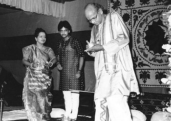 Sudha Dutt, Ratikant in centre, and Guruji acting in a Hindi play 'Aadaab' LV: What was the motivation for you to institute the Guru Kelucharan Mohapatra Award? RKM: There is no single answer to this question. Paramount among the many initiatives closest to Guruji's heart was the annual "Guru Kelucharan Mohapatra Award". As anybody (who knew him closely 30 years ago) would tell you, Guruji had a deep concern for fellow artistes who like him came from impoverished backgrounds but continued on their creative journey - in folk theatre, stage theatre, classical dance, and even in cinema. It is important to note that there was hardly any financial support from the Establishment, even though the Orissa Govt. did recognize and honour his lifelong work in the Arts. Guruji was a "Patachitra painter", a dancer / percussionist, a stage actor as well as a choreographer for film sequences (also a day labourer and a mason as a young man). It was thus natural on my part to institute an annual award framework which gave due importance to meritorious people from these 4 creative fields - Dance, Music, Theatre and Cinema. Guruji's great gift to me was to implant in me a hunger for excellence in classical dance, percussion and the attendant music. I continued to work hard for the success of the "Guru Kelucharan Mohapatra Award Festival" out of the need to repay the debt of gratitude to Guruji and a number of other contemporary stalwarts whose work and great enthusiasm keeps on providing me with the necessary momentum. Among them are the great Pt. Bhubaneswar Mishra, Pt. Raghunath Panigrahi, Sanjukta Panigrahi, Rakhal Mohanty, Pt. Birju Maharj, Pt. Jasraj, Girija Devi, Shyamanand Jalan and Mahant Maharaj ji Sri Veer Bhadra Mishra of Varanasi (Sankat Mochan Music & Dance festival). As has been mentioned in the vision statement of Guru Kelucharan Mohapatra Award, "The underlying principle of this award is also to generate a fellow feeling amongst the performing artistes who can, individually and severally, focus all their energies into taking their art to splendid heights, through mutual consultation and collaboration." LV: Now that this is the 16th year the award has been bestowed, do you have any specific plans for forthcoming years? RKM: Yes. It will be my constant endeavour to take the Award festival to even greater heights that it has already reached in the last 16 years. In spite of the increasing difficulties of sourcing funds for a festival of this status and size, I would like to broaden the scope of the award framework to include notable awardees from outside the State. There will be of course, concurrently, awards for deserving artistes from Odisha. I dream of the day when the award amount will be big enough to be of real help to the recipient and the performance quality in the Award function, per se, will match the finest classical festivals of India. My people at Srjan and I have already covered quite some distance on this particular journey. LV: How do you select the artistes to perform at the GKMA Fest? The artistes of the 3 days I saw were all performing for the first time at Bhubaneswar. RKM: We try to provide a mix of famous performers and some relatively new names who are all artistes of quality. The idea is to showcase artistes whom our Odisha audience has not yet tasted, both established and budding artistes. Apart from the obvious novelty of a star performer, the added benefit is to a new generation of dance and music students who get a direct exposure to artistes that they have only heard about. Plus, we take care in designing each evening's performance with an eye on the most suitable combination of artistes and genre. LV: You conduct around 4 major festivals every year. How do you manage the funding? RKM: That question hurts where it pinches!! Since there are relatively few reputed industrial houses in Odisha (compared to metro cities and other States) and since the sparse Govt. funding for performing arts has to be thinly distributed, our work in raising funds is getting increasingly burdensome. However, the goodwill that Guru Kelucharan Mohapatra earned in his lifetime, both with his art and his personal warmth, has helped us to at least make an optimistic approach to both Govt. agencies as well as industrial houses which are beginning the activities here. There are of course a few loyal sponsors, both financial as well as media sponsors, who have ensured that we are able to mount these 4 festivals every year with a degree of success. These festivals are "Guru Kelucharan Mohapatra Award Ceremony", "Marga Darshan (GKCM Purush Dance Festival meant exclusively to present male dancers), "Samsmaranam (held to mark Guruji's death anniversary)" and "Deesha festival" at Kolkata (held under the aegis of Guru Kelucharan Mohapatra Yuva Prativa Samman), which provides a much needed platform for young dancers