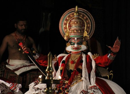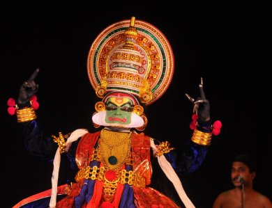 Costume and makeup are very important in Kathakali. Could you please elaborate on the shringara aspect? Yes, we must admit, the first attraction of Kathakali is the costumes and makeup. The layman doesn't know the hand gestures etc., but everybody is attracted to Kathakali because sarvendriyanam nainam pradhanam - the eyes are the most important among the five senses. Kathakali's one advantage is the colourful makeup and costumes, but sometimes they are misused. It is very colourful and so unnecessarily, it is used for advertisements etc. without any sense of the art. I have had so many bad experiences. In Kathakali, the characters are superhuman characters - gods, demigods - and even human beings have superhuman qualities, they are not normal persons. To depict such characters, it needs extraordinary costumes and makeup. For that, the founders of Kathakali had enough inspiration in Kerala. The ritual art forms of Kerala are so rich in colour. Those costumes and makeup inspired them and they developed separate costumes and makeup for Kathakali. They were also influenced by the Natya Shastra, because colours have a definite significance in the Natya Shastra. For example, green is for good, noble characters. Theyyam, Mudiyettu are the local ritual art forms. Theyyam is the most colourful dance form in the universe, according to me. If you see a character - there are over 400 different characters - some are so beautiful... It influenced them, but in Kathakali, there is not that much intricate lining etc. Just to give the effect for the emotions. Just to give the frame inside so expressions will be brighter and clearer. But in Kathakali, the expressions are not lokadharmi. It is totally, totally stylized because the language is stylized, Sankritised Malayalam, very loud and dramatic percussion, stylized way of acting - everything is stylized. The emotion also must be stylized then - when two negatives come together, then it is an original, not artificial. The characters are divided mainly according to their qualities, guna, the triguna - satva, rajas, tamas. First is satva, noble characters like Bhima, Yudhishthira, Shiva, even Shri Rama, all in one group called 'pacha.' Pacha in Malayalam means green. The main colour of makeup for this group is green, with pink lips, black and white around the eyebrows, Vaishnava namam and white border. In that, there are further divisions - e.g., Krishna has a different wig and costume variations, Bhima is different, the headgear will be different too. The next one is rajaguna - powerful, aggressive and sometimes romantic characters, like Ravana, Duryodhana - most powerful anti-heroes are in this group. Very beautiful makeup and costumes of this group, kathi, and the presentation is also very romantic. It became more predominant in Kathakali than even the good characters. Kathi - in the makeup there will be a knife; kathi means knife. There is a knife pattern either on the cheek or on the forehead, and a white nose, to give a little humour to that character. In that also further variations are defined - you cannot make any change. Third is called thaadi - thaadi means 'beard'. But not a beard like Parashuram - it is an extension for the face. It looks like the face extended wider. Thaadi has mainly three groups - red beard, which are the most arrogant, thoughtless, rude, rough characters like cannibals, rakshasas, even Dushasana. In that group, there are also Bali, Sugriva etc. because they are animals, not civilized, but with slight modifications to the makeup. White beard is for characters like the monkey chief Hanuman, who is worshipped, Nandikeshvara etc. Black beard or karutha thaadi is for very primitive, uncivilized forest hunter dwellers, e.g., Shiva's fight with Arjuna dressed as a hunter, that hunter was one such character. Another division is called minukku - 'polished'. All the good and noble heroines of Kathakali will be in this group. There is no mask. There are many variations in this - rishis, Narada, Durvasa - but costumes will be different. Plus, folk characters like fishermen, washermen, charioteer etc. Mainly minukku is female characters. In female, there is another group of demoness - Surpanakha etc - rude characters, fully black, big bosom, ugly look, called kari, which means carbon or black. Another group is called theppu - painting or drawing - which is for animals and birds, Garuda, Jatayu etc. Kathakali costumes are now very costly. Only for one character, nowadays, it costs almost Rs.70,000 to one lakh. For a group, with minimum 15 different costumes, it is normally a huge amount, so individuals have no scope. If I learn Bharatanatyam, I can perform solo, but for Kathakali it is not possible for individuals. In one way it is a drawback, in others, not so.