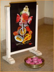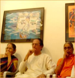 Collages - art, dance and storytelling by Lalitha Venkat, Chennai e-mail: lalvenkat@yahoo.com Photos: Lalitha Venkat November 30, 2003 ![]() Artist, musician, stage and set designer, costume designer, critic...V V Ramani is a multi-faceted personality. IMAGES, his creations of collages on exhibition at Lalit Kala Akademi from November 21 to 27 clearly displayed the inter-connectedness of his art with dance. Recently, for The Hindu's 125th anniversary celebrations, Ramani and his wife/colleague Hema decorated the foyer at the University Centenary Hall and a décor using only jasmine flowers and green leafage for the banquet honoring the Indian Prime Minister Vajpayee. It was appreciated by one and all and led to N Ram, the Editor-in-chief of The Hindu, inaugurating this exhibition. There was a good representation from the dance community (with whom Ramani has worked through the years) with the presence of Kalanidhi Narayan, the Chandrasekhars, Lakshmi Viswanathan, Alarmel Valli, Gopika Varma, and Indira Kadambi. Singer Aruna Sayeeram, friends and upcoming dancers were also present. Sour note: There was a conspicuous absence of fellow artists. In making the collages, the bits of paper are so cleverly used that not only are the images life-like, the colors are also striking, like the various shades of blue juxtaposed with black for the Krishna images. Kali's demonic aspect is highlighted by her dark blue face and a bloodstained red tongue hanging out. The Ravana portraits are made up of warm, earthy tones of ochre, reds and greens. The Ganesha portraits are bright and cheerful. Being involved in so many diverse activities, where did Ramani find the time to create so many brilliant pictures, the colors blending harmoniously, the images so simple, yet so dramatic? Ramani talks about his career choices and what inspired him to come up with this solo exhibition. "After finishing my schooling, I studied painting in the College of Arts, Chennai. That was my first introduction to what I am doing today - collages. I was introduced to it in my 2nd year at college by one of my lecturers Alphonso who directed me to start off with bits of paper or any material. That's how the collage caught my fancy. Then I diversified into painting. After completing college I trained in textile designing. This taught me a new dimension in art because I knew nothing of textiles. So, I started on the textile-designing phase of my career. After quitting that, I got a job in Coimbatore, since it was close to Madras, but I returned soon because of the difference in attitudes there and started freelancing. It led me to so many things. My interest in films, dance and music took me to various performances. That triggered off my stage work. I used to attend lec/dems at the Krishna Gana Sabha. Sitting at the back, I would look in awe at all the dancers. Even though I used to do vocal accompaniment for some dance performances, I never even imagined that I would take to the stage in a different way. ![]() Once, I took my paintings to Gomathi.Vishwanathan, wife of Enfield Viswanathan (Kalamandir Trust ) as he was known. I told her they were presenting music and dance, so why not visual art too? She agreed and along with the dance festival, I had my painting exhibition at the Narada Gana Sabha foyer. It was strange to see the dancers just walk past without even glancing at my paintings! The next year, they held a festival called Devata Vandanam. She asked me to do the stage décor for that and I hadn't the faintest idea of what I was going to do. Fortunately, whatever I visualized must have been a hit because my stage design career took off from there. In the textile field, I designed sarees and ready-mades for Radha Silks. My stage work led to theme decorations at weddings and other functions. After doing all these things, I came to a stage when I wanted to get back to my roots. That's where you get full happiness. You are not answerable to anybody, you do what you want and there are no restrictions! So, I started to do painting and collage. I did not want to combine the two. I wanted to focus on collage. Once some interesting work started taking shape, I thought I would exhibit them". ![]() Did you have any particular theme in mind when you started work on this series? I basically started with the idea of doing things close to my heart. My association has been basically with music and dance, as also a childhood fancy for Krishna. I wanted to do a complete series on Krishna, but once I started, a whole lot of ideas came to me. So, I moved away from Krishna to other things. How do you go about your creation? Do you choose the design according to material or the other way round? Sometimes I start off with some image in mind. Other times, a small visual in a paper triggers off a complete new image for me. The whole thing becomes like building an architectural piece. I have to source the parts that fit in, like in a jigsaw puzzle. You have done 10 images of Ravana, depicting the nava (9 ) rasas. Why 10? Yes, Ravana is a childhood fantasy. I did my schooling in Delhi. Every Ramlila, there were these huge effigies of Ravana everywhere. That image stayed on in my mind. This was planned as Ravana having different emotions - the navarasas. Otherwise I would have just done 10 portraits. The navarasas comes from my love for dance and my association with dance and dancers over the years. I framed everything separately and placed them in a row with shantam on top. Whether it is Ravana or anybody else, one finally aspires for shantam, so it's navarasas culminating in shantam. In the Kaliya image, the inverted car was what set off my imagination. When I completed Kaliya, I did not want Krishna to upstage Kaliya's powerful personality. I wanted Kaliya to be the hero. Even a small image of Krishna's face would draw attention only to Krishna. So, after a lot of deliberation, I depicted only the back of Krishna's head. There is no distraction and th