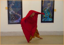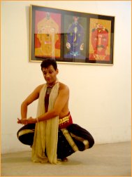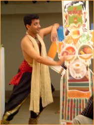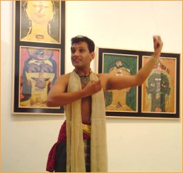 ![]() Following the inauguration of the exhibition, Srikanth presented Collages through Dance, starting with Ganesha for which Ramani lent vocal support (another of his talents), then Ravana and ended with Krishna. The items were chosen to complement the images on exhibit. "Ramani asked me to do something using collage as a theme. I love Tamizh as much as I love dance. I am very confident about my prowess in Tamizh. So I did one piece in proper Bharatanatyam on Ganesha. For Ravana, I wanted to do something different. I took Ravana's pralapam (soliloquy), as a great Shiva bhakta, a great Vainika, a great king and so on. Everything comes to naught because he covets the wife of another man and the good qualities get lost and only the demonic traits take dominance. I wrote the Tamizh text myself with assistance from Mr. Raghuraman. For the 3rd item, I wanted to do raas in folk style, next to the puppet. So, I took Ramani's idea and mixed raas movements with puppet movements." "I eagerly awaited this performance as I sang, spoke and danced, all together, in this show. It was very challenging and I enjoyed it immensely. This is my first experience of performing at an art exhibition. I look forward to doing more such shows. I also want to do programs based on Tamizh. I want to do Ravana as a full-length production. Next year I plan to do a full length production Nirmalyam based on M T Vasudevan Nair's award winning film of the same name". Srikanth participated recently in the Summer Residency Course in teachers training conducted by Kala Bharati and Mamata Niyogi-Nakra in Montreal. Teachers from across USA and Canada attended it. Guest lecturers were S P Sundaram of Sruti, Devesh Soneji, Vincent Warren and Sarasi Raj to name a few. Srikanth represented 'Tradition and Beyond' since he's from the Bhagavatamela tradition and is a regular performer in Bhagavatamela natakams. He presented a paper on Bhagavatamela, what are the changes that have happened, what are the elements that will never change - like girls not being allowed to perform in Bhagavatamela natakam and so on. During the Chennai December season, Srikanth has 4 solo programs, something to be proud of, as male dancers seldom get such opportunities.