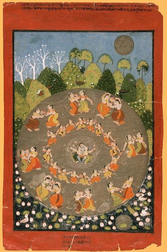 According to Vaishnava doctrine, the timeless and endless rasa lila of Krishna is the source of a stream of rasa that flows perpetually from the eternal Vrindavana to the earth and further it is this same rasa that flows as a stream of rasa to and between mankind. It is a timeless dance in which the divine and the human lose themselves in the rhythms, movements and melodies of pure love. It is only fitting that the rasa lila has been called sarva lila chuda mani, the crest jewel of all lilas of Krishna. The rasa lila is a river and a fountain which has no beginning and no end, it is a stream so broad that it has no other shore, it is an ocean of nectar and of youth, of life and vitality, of joy and bliss. To drink its waters is to find love and to be touched by its waters is to find freedom, to be blessed by it is to find divinity and to be nourished by it is to find oneself, for has it not been said rasa iva saha.