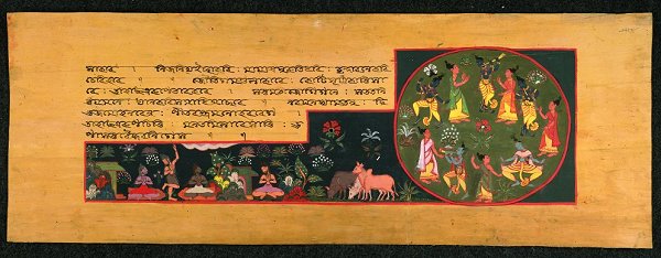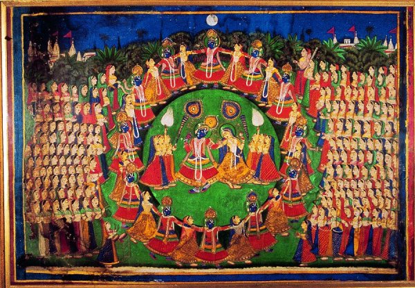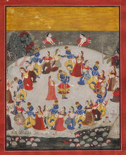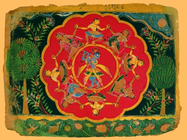 It is interesting to note that Jain texts of this period also mention the rasa. From then on circular dances called variously rasa, rasaka, hallishaka and charchari were well known and discoursed in texts on dance and music. It has been suggested that "the hallishaka (out of all the circular dances) mentioned in the Harivamsha denoting a circular dance of many women around one man, may have been the earliest." (P. 174) The rasa became an important part of the literature of the bhashas and thus entered the pushtimarg Vaishnava tradition particularly in Gujarat and Rajasthan and equally in Bihar and Orissa and was subsequently taken to Assam and Manipur when Vaishnavism spread there. However, Vrindavana remained the hub of the Bhagavata faith and Vaishnavas from all parts of India gathered there to celebrate the love of Krishna and returned to their homes and carried the rasa, in all its theatrical richness with them. The dancing and the fluting Krishna became the leitmotif of Vaishnava literature across the country and it is not surprising that artists in Rajput courts were greatly touched by it. We are here mainly concerned with the painted rasa lila and not so much with its representation in the other arts, although in a sense they cannot be separated as one feeds on the other.