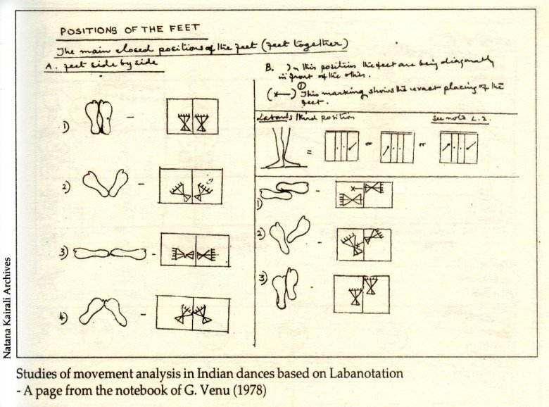Inventing of a Notation System for Mudra: The language of Dance and Theatre in Kerala - Part 1 - G. Venu e-mail: abhinayakairali@gmail.com April 27, 2019 Dance Notation Dance Notation is the medium by which the body movements are scientifically analysed and are delineated accordingly through the appropriate use of symbols. There is documentary evidence to show that from the 15th century itself dance was notated in the West. Recently I happened to read that even many centuries prior to this, the dance steps of Buddhist rituals in Tibet were documented using signs. The most popular notation systems available for Western dance is 'Labanotation' and 'Banesh System'. I did try to learn 'Labanotation'. In the Western style of dance, importance is given to the movement of the parts of the body and choreography. But in Indian dances, equal importance is given to all the constituent parts and subparts from the head to the foot. The different parts of the body have different movements. The notation system of the West and their symbols is not sufficient to document the Indian dance forms. Dr. Kapila Vatsyayan who had studied 'Labanotation' much earlier has also made similar observations. I have devised a dance notation system to record Kathakali mudras in 1965. This article is about delineating and publishing 1752 mudras of Kathakali, Mohiniyattam and Kutiyattam over the years which has become perhaps the world's largest collection of hand gestures. ![]() A page from Venu's Study based on Labanotation or Kinetography Laban by Dr. Ann Hutchinson [1969] ![]() Studies of movement analysis in Indian dances based on Labanotation - A page from the notebook of G. Venu [1978] In the world of Kathakali I saw Kathakali for the first time when I was studying in the fifth standard. It was at a festival at the Nedumangad Mukkolakkal Bhagavaty temple. I vaguely remember it to be Narakasuravadham. Someone made me sit in the dressing room. In those days small temples did not have separate dressing rooms for Kathakali. Makeshift arrangements were made and the neighbours' cowshed was cleaned up to function as the dressing room which was a little away from the stage. When the make-up was done for the demoness (Karivesham) someone lit the fire torch to lead the way. Many children accompanied the artist to the stage with a lot of noise. Since there were people all around, the actor was in the mood of the character as he walked up. It was a fantastic experience. I was in a dream world where people from an unknown world came upon the stage singing and dancing, kept appearing and disappearing. My excitement was boundless. The performance I saw that day was a turning point in my life. It aroused my desire to enter the wonderful world of Kathakali. From the next day onwards, I used to gather whatever clothes that were available and started dancing. My elder brother Rajan Nair was my accompanist, beating rhythm with an empty tin. For many days in the evening this was our entertainment. My father heard about it and with a few of his friends once secretly saw our play. He was impressed and the very next day he started to look for a Kathakali teacher. I started training in Kathakali on the next Vijayadasami day in the attakkalari (training centre) my father had started. Keerikkattu Sankara Pillai, the only son of Keerikkattu Kochu Velu Pillai who once strode Kathakali venues in the South, was the Asan (Guru). Though Sankara Pillai trained under his father, he did not shine very much on the stage. But he was a strict teacher. The kalari was near the temple Karippuru Mudippura, about two miles from our house. I would have an early supper and by twilight walk to the kalari. There were three others who trained with me. At the initial stages, in the evening we learnt exercise of the eye, training in rhythm, and hand gestures. By ten o'clock all four of us would go to sleep on two mattresses in the kalari. We never had any pillows. At three in the morning, when we were deep in sleep, Asan would wake us up. We were all scared of him and so we promptly got up and ran to wash our face. ![]() Keerikkattu Sankara Pillai and his disciple G. Venu [1956] - Massage during Kathakali training After physical exercises, we would start with the first foot work in Chembata rhythm in a slow speed, ascend to the fourth speed gradually and descend to the first. The first step 'titta tatta' was practiced for months together. The training of the steps was so strenuous especially when the knees were bent and the heel touched the knee, each time before stamping. This was extremely painful, especially for the body below the hip that one almost wanted to die. During the monsoon, for two months, Asan himself would do oil massage on our body. During this period, in the evening there would be Cholliyattam. Thoongayil Bhaskara Pillai was the vocalist and Keerikkattu Vasu Pillai played the Chenda (drum). We had to get up on these days at three thirty. We would have our bath at five thirty and reach home. By then it would be time to go to school. We had to walk three miles to the school. In spite of all these difficulties, I never wanted to give up my Kathakali training. This, for me, is the power of art. My training from the beginning itself was with a lot of enthusiasm and a feeling that I was in a wonderful world. Our enthusiasm will grow the more we study what we like. My first performance on the public stage was when I was thirteen. The kalari continued to function well for few more months after this. Then my father was forced to wind up the kalari due to financial crisis. When the kalari was ended, Asan suggested that I should be sent to a noted Kathakali school for further training but my father was not interested in it. My father firmly believed that classical art forms must be trained only through a mentor neophyte relationship. The second stage of my Kathakali learning started at Viswakala Kendra, at Vattiyoorkavu, Thiruvananthapuram, established by Gur