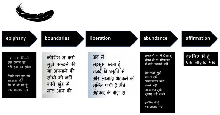 The three acts - Fire, A Question, and Trigger - serve as a mirror to the contemporary injustices of our society, expressed through the idiom of classical Indian Odissi. TAPA: Response: A silent dialogue between performance and audience TAPA drew a full house, with people from diverse ethnic backgrounds. As the dances progressed, a profound silence enveloped the auditorium, accompanied by contemplative expressions and, in some cases, tears - reflecting the emotions, or rasa, evoked by the performance. This cathartic response reinforced my belief that dance has the power to create a space for connection, honoring both traditional and contemporary elements while preserving the essence of tradition. It also became evident that by addressing the shared concerns of the audience, I was able to foster a deeper connection and understanding, establishing a bond that was unlike any I had experienced before. Review: Moment of catharsis "My dear friend Dr. Rohini Dandavate, a doyen of the classical Odissi tradition, addressed the contemporary moment of environmental catastrophe, political confusion, and social unrest. Her piece sparked anxious questions, which she answered with hope. The captivating blend of classical Odissi form and contemporary themes makes for a powerful call to action. At once poetic and poignant, the dances tackle complex themes with the compassion and curiosity of an artist par excellence. I walked out of the theater, stunned and inspired. The duality was searing. The pieces ask urgent questions of humanity, prompting us to consider our ability to both create and destroy. I found myself asking questions and finding answers in the work." - Manjula Nadkarni, CEO, Yuni This review reflects the profound impact of the performance, highlighting how art can resonate across cultures and foster meaningful dialogue. It underscores the transformative power of dance in addressing pressing societal issues and creating a shared emotional experience. Ek Azad Pankh My most recent choreography, inspired by the metaphor of a feather, explores a journey of curiosity. It invites the audience to reflect on the fragility of exploration and the freedom that comes with seeking new experiences. ![]() From verse to movement: Uday's poetry as a creative catalyst This piece is based on the poem The Unstuck Feather, written by my husband, Uday. In the poem, he recounts a fleeting encounter with a feather drifting atop a mountain in San Francisco. He reaches out to catch it but misses, watching it float away on a cool breeze. This moment sparks his imagination, leading him to reflect on his personality and his quest for meaning. The journey of the unstuck feather symbolizes his own life experiences. The emotions conveyed in his poem inspired me to choreograph a dance piece. I began my process by researching the symbolism of feathers across different cultures and reflecting on how Uday's portrayal in the poem mirrored his deeper reflections. ![]() My collaborators Dr. Kaustavi Sarkar, Dr. Anirban Bhattacharyya, and Ramprasad Ganavarappu - my collaborators on this project - each brought elements of their personal journeys to the poem. Building on the creative synergy we had established from previous collaborations, we enthusiastically conceptualized the dance and music, eager to interpret and unravel its meanings through movement and rhythm. Despite residing in four cities across two countries, we maintained regular communication via Zoom and social media. Our weekly meetings were vital, fostering rich discussions and the exchange of ideas regarding the concept, structure, form, movement, and music composition. Framework: Weaving words and movement into a cohesive story After several attempts to choreograph the piece using the English version of the poem, it became clear that the words didn't align with the envisioned music. We approached Uday to translate the poem into Hindi, and he generously created a framework of keywords summarizing the central themes of each stanza. This allowed us to select stanzas that preserved the poem's sequence while also choosing additional episodes to enhance the narrative. With this framework in place, I was able to conceptualize the dance, weaving Uday's reflections and emotions into graceful movements and expressions within a specified time frame. The diagram below illustrates Uday's keyword framework. ![]() To craft a cohesive narrative, we linked the keywords from the stanzas, using them as the Sthayi (the initial phrase of a melodic composition in Hindustani music). We then expanded on the main ideas through rhythmic sequences (nritta) and expressive gestures (abhinaya), incorporating symbolism and interpretation based on my envisioned narrative. The storyline conveyed a sense of awe and the poet's profound understanding of reality through the simplicity of a feather. Uday's insights and his appreciation for nature's boundless beauty inspired me to weave a tale that also included experiences shared by all project partners. The diagram below illustrates the selected stanzas incorporated into the dance narrative. ![]() The Narrative I began the narrative-writing process by exploring the symbolism and meanings of feathers across various cultures. My research revealed a range of interpretations, showing that feathers are often seen as symbols of universal love - a gentle force that allows itself to be carried by the wind, landing softly beside you. In spiritual contexts, feathers signify a connection to higher realms and divinity. Linked to birds, they symbolize not only physical flight and freedom but also mental and spiritual liberation. Drawing from these rich symbolisms and beliefs, I expanded upon the spontaneous and insightful verses of Uday's poem to craft my narrative. Visualizing scenes, I used the expressive and vivifying movements characteristic of Odissi dance. Ram's syllabic beats and Anirban's arrangement of swaras provided melodious patterns in meter and rhythm