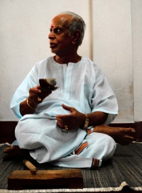 He was one of the first of the 'international' dance gurus who cultivated students from all over the globe. They came with their mothers and soon it was more difficult to meet Lakshman Sir in Chennai as he jetsetted to U.S, Europe, Sri Lanka, Malaysia and Japan to teach or conduct performances. Before Lakshman Sir became too popular overseas, his dance studio in Gandhi Nagar was a veritable 'dance factory'. The main dance room was a thatch-roofed square pavilion without walls. The cement floors were not overtly hard and made such slapping noise when we stamped that they almost sounded like cracks of gunshots. The floor had been specially compacted before it was cemented and was lovely to dance on. It was compulsory for the boys to wear dhoti and the girls to wear dance saris. The classes started early in the morning and continued till night. Lakshman Sir himself gave the morning adavu class and taught his repertoire afterwards. His works such as Todayya Mangalam, kautvams, thillanas and varnams were considered the 'in' items in the 70's and 80's. Lakshman Sir was not known for his abhinaya or expressive dance but his signature works would always have the complex rhythmic dance nuggets, which challenged our virtuosic ability. His compositions were made for us to move and dance! Lakshman Sir spoke clearly in class and was never hurried. Explanations or anecdotes were usually done between difficult passages, so as to give us time to breathe normally again. I used to listen intently and took notes whenever he said something profound. I was among the privileged few who were given Lakshman Sir's excellent coffee whenever he had one himself. I was never ever scolded by Lakshman Sir and he hardly ever corrected me. It was here in the Gandhi Nagar studio that we sweated it out, drunk with dance, performing untiringly and with relish, to master his repertoire, which are now 'classic' pieces. Lakshman Sir was the focal point, and we could sense the genius whose creative impulse was being stirred up. He took us along with his amazing burst of inspired creativity for more than 15 years. We sensed that it was important to be part of this fresh movement in Bharatanatyam. There was such a traffic of musicians and dancers, to and fro, in his house. Bharatanatyam stars such Yamini Krishnamurthy, Puspa Bhuyan, Swapna Sundari visited him for special classes, to commission new works, or to ask him to conduct their dance performances as nattuvanar. Dance gurus and musicians came, conferred and went. Simultaneously, dancers were groomed and made. ![]() Ramli with Guru Adyar K