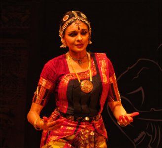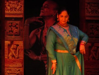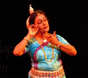 Ratnagiri is just 5km away and one has to climb up a few steps first. The magnificent ruins comprise 2 quadrangle monasteries, a single winged large brick monastery with a beautiful doorway, a sanctum with a colossal Buddha, an enormous head of Buddha, and many Buddhist sculptures. There are brick shrines, a large stupa with numerous smaller stupas around it, and a tall Buddha sculpture placed dramatically in front of a banyan tree. Ratnagiri was a great Tantric centre of Buddhism. Both these places are beautiful, now in ruins amidst lush greenery but the view now from the hills showed a landscape inundated with floods - water as far as the eye could see. The visit to the Ratnagiri museum and to Lalitagiri is for the next visit to Bhubaneswar! The Jajpur village people staged a dharna in the middle of the road protesting against govt inaction while people were starving due to the floods, and it was after 90 minutes that they allowed our cab to move (as a special concession), resulting in our missing a part of the first performance of the evening, Mohiniattam by Sunanda Nair from Texas. Clad in a beautiful white costume with maroon border, she presented one full length item “Bhavayami Raghuramam” depicting the story of Ramayana. The sethu bandana scene had Sunanda heaving and throwing rocks so realistically, we could almost envision the bridge shaping up. One could see touches of her Kathakali training now and then. The item ended on decorations being made for pattabhishekam and welcoming the royal couple with music and fanfare. Sunanda was all praise for the appreciative audience and hailed the GKMA Festival as one of the important dance festivals of India.
