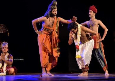 The role played by Anjaneya was so vibrant that many could experience kinaesthetically something similar to the physical sensations of the artiste. Though one felt excess of yellow on cheeks, to enhance the protrusion of reddish jaws, could have been avoided. There was maturity and poise in the character of Valmiki and Vashista. The beauty was this hour long briskly paced dance drama was also spiced with sublime incorporation of sculpturesque poses of some characters with appropriate ragas like Sahana accompanying such a scene. |
