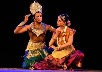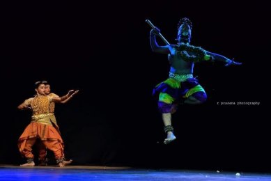 A dance drama has to pay attention to another important dimension i.e. space. This was also deftly handled as lighting was used very carefully (without being jarring or too bright- compromises necessitated by poor quality telecasting requirements) only to recreate the effects of distance, space, portray personalities from different milieus namely, those from the royal abode (Rama and his brothers) and those living in an ashram (Lava, Kusa and Valmiki). Battle scenes were set in suitable nadais (rhythmic patterns) in chatusram, mishram and kantam with appropriate raga patterns. Bharatanatyam’s key feature is nritta with its complex rhythmic footwork of strikes, extensions, jumps, leaps, intricate patterns made by movement of hands and legs appropriately and not exaggeratedly (then it becomes too theatrical) all stemming from an extended and dynamic torso with controlled movements creating perfect geometry in motion was well portrayed through generating and releasing the emotion of the character of Anjaneya played by a senior male Bharatanatyam artiste and the guard of the hermitage of Lava Kusa. Both characters exhibited special effort or stylization, such as high kicks, leaps, or measured walks. They also manifested how Bharatanatyam requires unaccustomed patterns of muscular exertion and relaxation as well as an unusually intense or sustained expenditure of energy and showed how a dancer may become intensely aware of the force of gravity and of a state of equilibrium or disequilibrium that no one can experience in any other normal or acrobatic activity.