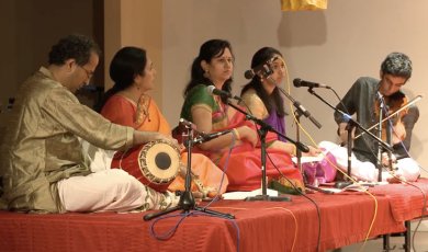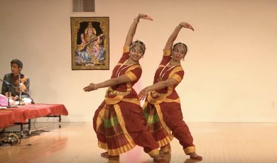 Parivaar in Milpitas, CA, on September 23, 2017. The evening started with a musical performance by Aks and Lakshmi of Eclipse Nirvana. They are a composer-vocalist (and husband and wife) duo who bring a modern take to traditional, spiritual compositions. Their music was a fusion of several styles, and they began with "Sur niragas ho" in praise of Lord Ganesha. During the first piece, the softness in Aks' voice combined with the richness in Lakshmi's set the tone for how they would complement each other throughout. They next performed the "Abhirami Stotram," where both exhibited their vocal range and excellent control over their voices, especially when hitting the higher notes. However, what was most apparent was the sanctity of their rendition. From explaining the history and significance of the composition before they began, to both of them smiling brightly, to Lakshmi closing her eyes and placing her hand at her heart in reverence while singing "Namostute," the devotion was palpable to everyone present. While the arrangement had several modern elements and the interludes demonstrated their flair with various styles of music, it was obvious that the intended spirituality of the piece was not compromised. In the "Margabandhu Stotram" and the "Bhagavati Stotram," there were several instances where their voices blended beautifully as one. The two voices coming together in lower ranges heightened the power of the pieces. They finished with the "Durga Pancharatnam." The orchestral backing and the video with their family singing in the background was a fitting finale to a captivating ensemble. Their soothing voices, creative fusion, and authentic enjoyment served as a welcoming opening for the evening ahead. Following this contemporary devotional segment was Talavadyam by the students of Srinath Bala, who also happens to be the maternal uncle of Aks! Shivaram Viswanathan, Anirudh Rao, Tarun Dinesh, and Ambika Ramadurai played mridangam while Shraddha Srinath (daughter of Srinath Bala) played the ganjira and konnakol. The students had only been learning for one year, and the unity and precision was stunning. The rhythm was maintained whether the mridangists picked up where another left off, or played in unison. And to tie it all together, Shraddha Srinath alternated between the ganjira and chanting in her resounding voice.The back and forth between students and teacher was delightful; from the youngest to the oldest on stage, each oozed confidence, and their teacher followed with a steady taalam from the center of the audience. After the high energy Talavadyam, the music segued into accompaniment for the dancers. We continued to see the recurring theme of family on stage as the sisters of Srinath Bala and Aks took the stage as dancers. Mother-daughter duo Shoba Subramanian and Aishwarya Subramanian were joined by brother/uncle Srinath Bala on mridangam. Vikram Shivakumar, student of Sandhya Srinath (Srinath Bala's wife) played the violin and Shraddha Srinath and Savita Rao (Sandhya Srinath's sister) were the vocalists for the evening. Joining them on nattuvangam was Jayanthi Balachandran. As the dancers ascended the stage, it was clear that this artistic family intended to share their love of the arts to the audience present.