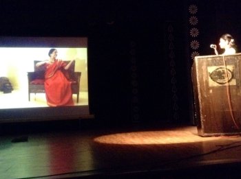 Daughter Madhu Natraj watching her late mother Guru Maya Rao on screen during her presentation of VRINDA - Courting Chastity