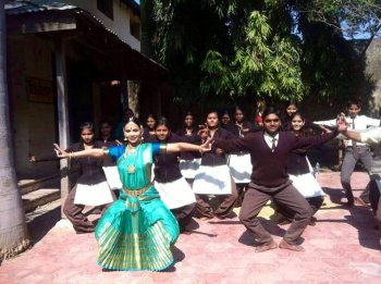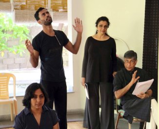 A rehearsal moment from LOTUS LEAVES WATER WORDS directed by Prasanna