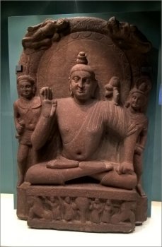 Buddhist triad from Mathura, red sandstone (AD 159-160), Ahichhatra, Uttar Pradesh (National Museum, New Delhi)