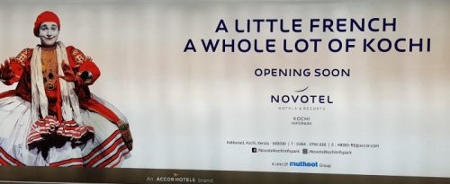 French hotel chain ACCOR NOVOTEL hoarding at Kochi airport combining French mime artiste and Kathakali costume