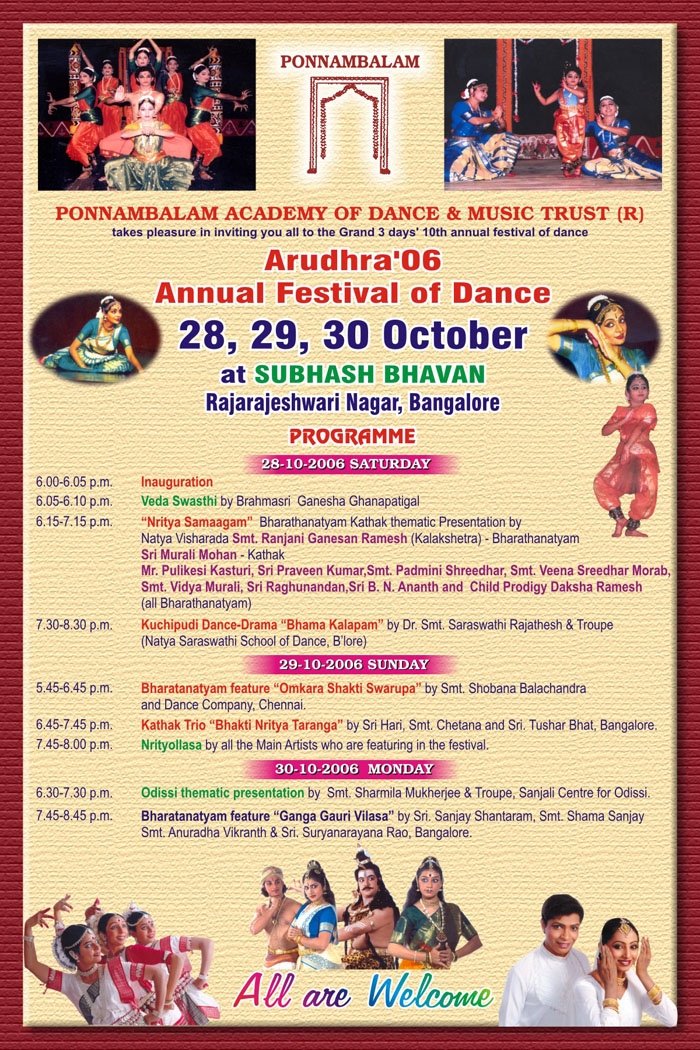 - Anuradha, Sanjay, Shama and Surya e-mail: dancetrioblr@yahoo.co.in November 5, 2006 We are proud to be artists of Bangalore, which provides its people with well defined art and culture and receives every individual's interest with a warm welcome. Life for any one is peaceful in Bangalore. We, as well established performing artists of Bangalore vouch for a cordial relationship between every artist here. But as they say, every peaceful life confront hurdles at some point of time, we too experienced it. We, the artists would like to share one such bitter experience with all the readers of Narthaki. Popular dance group of Bangalore consisting of well established performing artists Anuradha Vikranth, Sanjay Shantaram and Shama Sanjay who are the key artists of the group, were invited to perform at the Arudra Dance Festival organized by Ponnambalam Dance Academy. As requested by the organizer, we were to stage 'Ganga Gowri Vilasa,' a dance production which involved many artists. The venue was Subhash Bhavan, which is located amidst residential layout in a distant corner of Bangalore. The slot given to us was 7.45pm (email Invite). Considering the Bangalore traffic and the distance of the venue, one group of artists arrived at 7.15pm, who were all dressed for the show except one artist Sanjay Shantaram who had to wear a Shiva mudi, which he had to do only after he reached the venue. Anuradha Vikranth and other set of the artists arrived at 7.35pm, while the previous dancer Sharmila Mukherjee was still on stage performing. Since it was a very small auditorium and green room had no separate entry we had to wait outside the auditorium as the previous performance was still going on. Instead of greeting the artists who have come there with a sole intention to perform without any benefits, one of the oraganiser (Malavika Avinash) passes sarcastic comments and abuses the dancers for not having come two hours early. Uses all bad language and insulted all the artists, who was further joined by her father Mr. Ganesan, and dancer sister, Ranjani Ganesan. It was truly hurting as an artist and as an individual and all the artists decided to walk out without performing. As a responsibility towards the audience, we had to apologise for not being able to perform. These organisers who try to gain publicity by organising such a dance festival think they are beyond art and artists which will surely not take them far if they do not respect Art. We have no regrets for having done this and are proud not to have let down our Art. Maybe the dancer and the organisation have not got enough publicity for their festival and hence are using this as means of publicity. A similar incident took place in the month of February. The same organisation had conducted "Damaru Mahotsava" for Shivaratri. Shama Sanjay and Sanjay Shantaram were asked to perform at 12.30am. When they reached the venue with great difficulty, all that they found was the closed door of the auditorium. The organizers had left the venue without even informing the artists when they very well knew that the artists were heading towards the venue for the performance. They had even switched of their cell phones. In spite of this incident these dancers agreed to perform only on the request of their other group member. We just had to share this experience with all artists who could be cautious about performing for such organisations which does not value Art or the Artist. For sheer publicity... We have observed that the organizers of the Arudhra Festival are trying to gain publicity by first creating a scene at the auditorium, secondly instead of sorting out the differences between them and the group which did not perform, they go public by sending e-mails, sms's and now even online. RESPONSE TO THE MAIL SENT BY SAVITHRI GANESAN (Trustee, Ponnambalam Dance Academy) "We would like to also bring to your notice about misbehavior on the part of a budding dancer..." The organisers had been co-coordinating only with this dancer for the performance at their festival and not even extended a courtesy invitation to the other well known artists of the group. The dancer, who has been referred to as the budding dancer, is a well established performing artist of Bangalore and it is surprising the organisers are not aware of this. "who walked out of the festival without regretting the fact that she turned up for a 7.30 show (TO commence) at 8.00pm..." It is shocking that the organiser themselves do not remember the time slot allotted to this group. The time allotted was 7.45 and not 7.30. (Email of the invitation attached for the reference). Sharmila Mukherjee who finished her performance around 7.50pm, was still performing her third piece, when the group members were present at the venue completely ready with their costumes and makeup. The dancers were on time for their performance. "...while some of her troupe members entered the auditorium at 7.15 sans makeup..." All the dancers were ready with makeup and costume except one of the key artist who was playing the character of Shiva had to put on the Shiva mudi (headgear). I am sure you will all agree that one cannot sit and drive for an hour wearing the mudi. "We had to reschedule even the first concert of the evening since these artists had not come." Did the organisers forecast that the dancers to perform for the second concert would come in late? Or are the organisers trying here to cover up the inconvenience caused to the audience for keeping them waiting as they had started the day's concert at 7pm instead of 6:30pm? (just a query) "Having put the organisers and the audience to an inconvenient situation by coming late..." Audience was still enjoying the Odissi performance by Sharmila and her troupe when the artists had arrived, so where is the question of putting anyone in inconvenient situation? "Even as another senior artist who was to perform with this budding dancer was keen to perform, was left helpless..." I would li